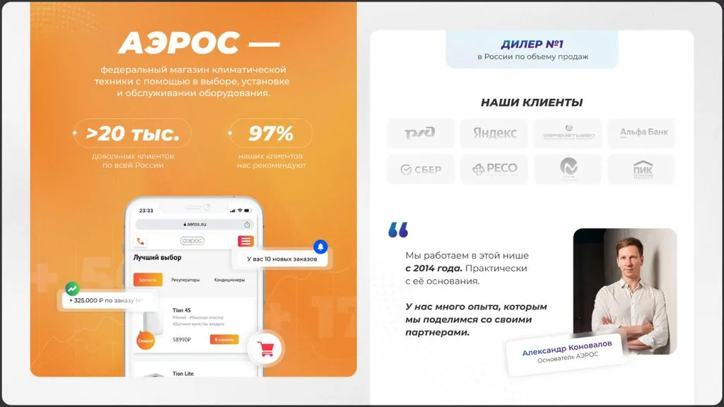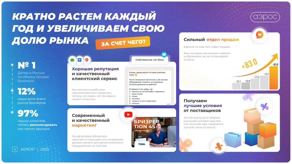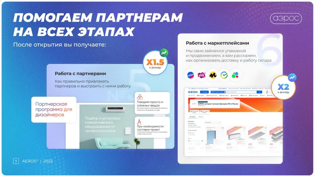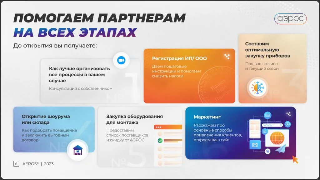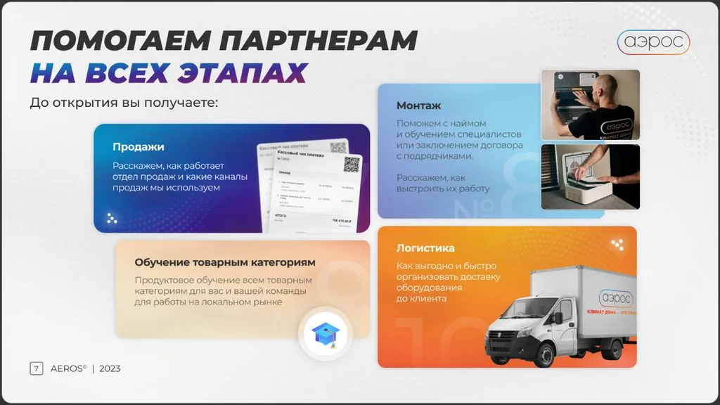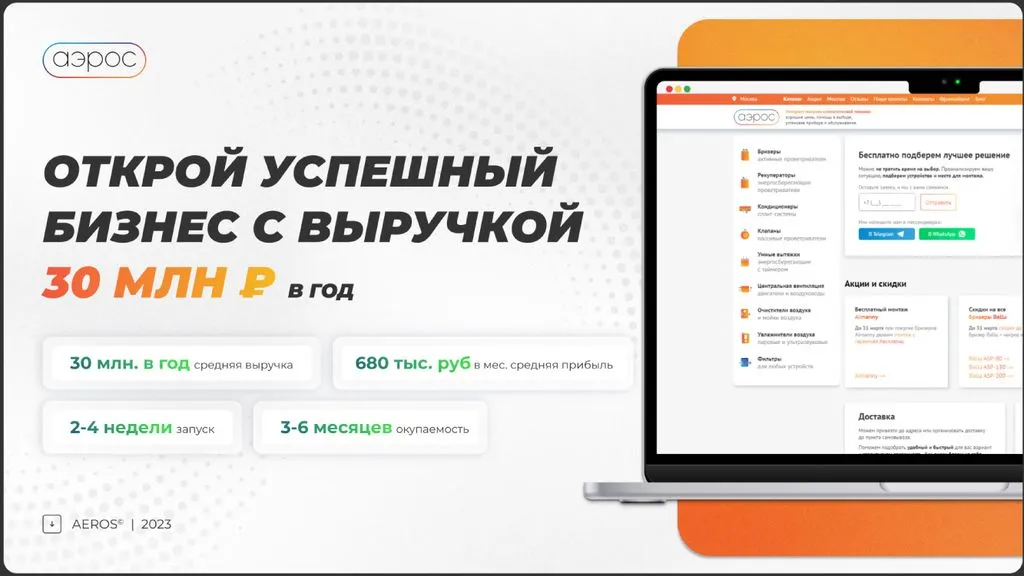 Мы берем на себя продажи, маркетинг, ведение сайта и маркетплейсов. Вам не нужно беспокоиться о потоке клиентов и заявок — мы сопровождаем на каждом этапе. В этом участвует не только команда «Аэрос», но и собственник сети. Наша цель — развитие бренда по всей России и увеличение доли рынка 📍.