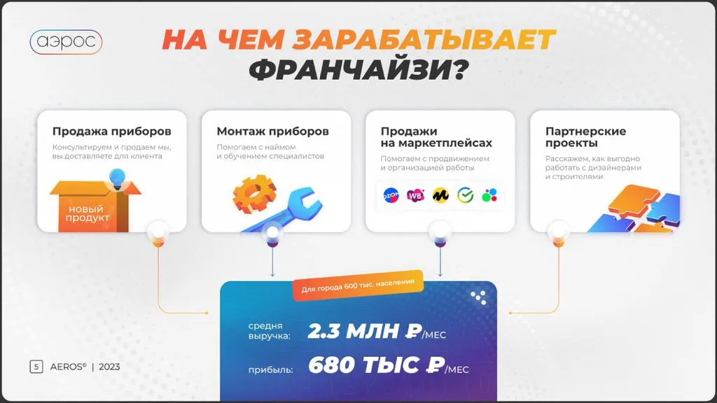Франшиза «Аэрос» — это возможность зарабатывать на продаже, установке и обслуживании климатического оборудования до 680 000 рублей чистой прибыли ежемесячно, благодаря полной поддержке профессиональной команды.