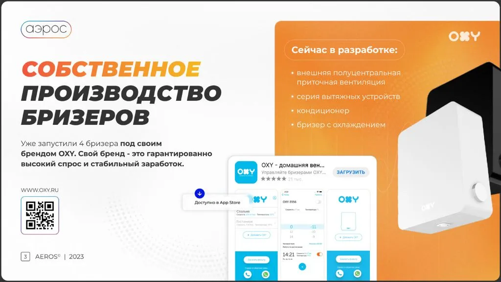На сегодняшний день «Аэрос» — ведущий дилер климатической техники в России по объему продаж бризеров. Мы являемся официальными представителями более 24 производителей и выпускаем бризеры под брендом OXY.