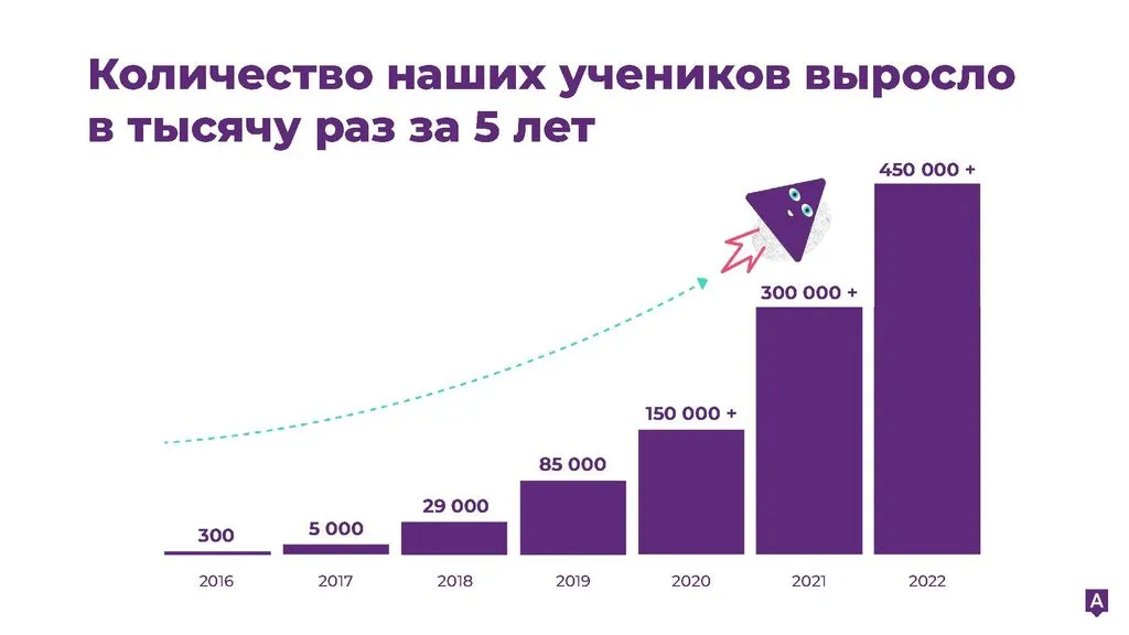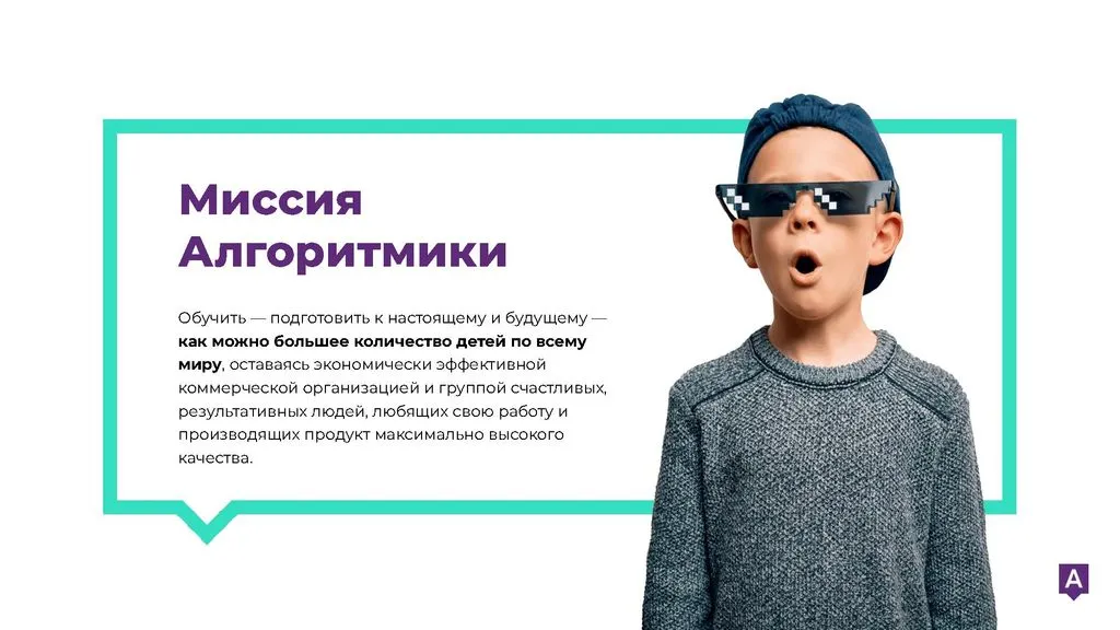 Миссия Алгоритмики: Обучить как можно больше детей по всему миру, подготовив их к будущему, оставаясь эффективной коммерческой организацией и коллективом счастливых людей, любящих свое дело и создающих продукт высокого качества.