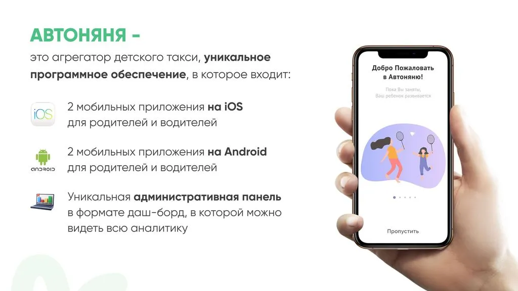 «Автоняня» — это сервис детского такси с мобильным приложением. Это уникальное программное обеспечение, разработанное специально для российского рынка, которое включает в себя: