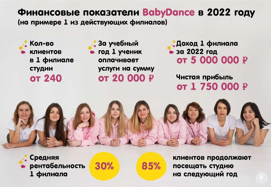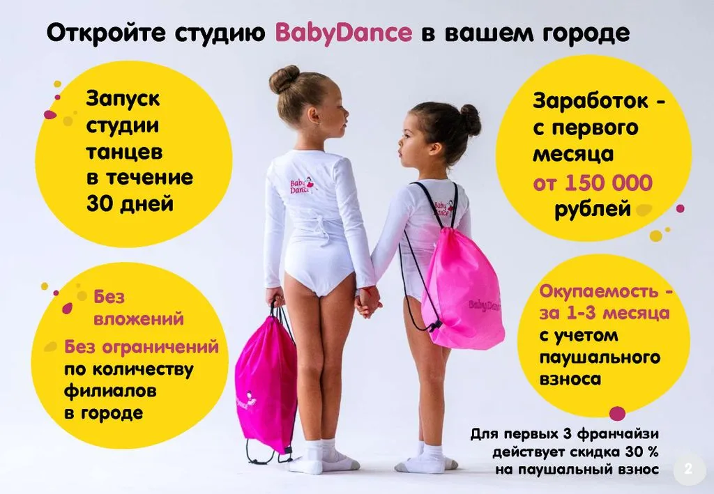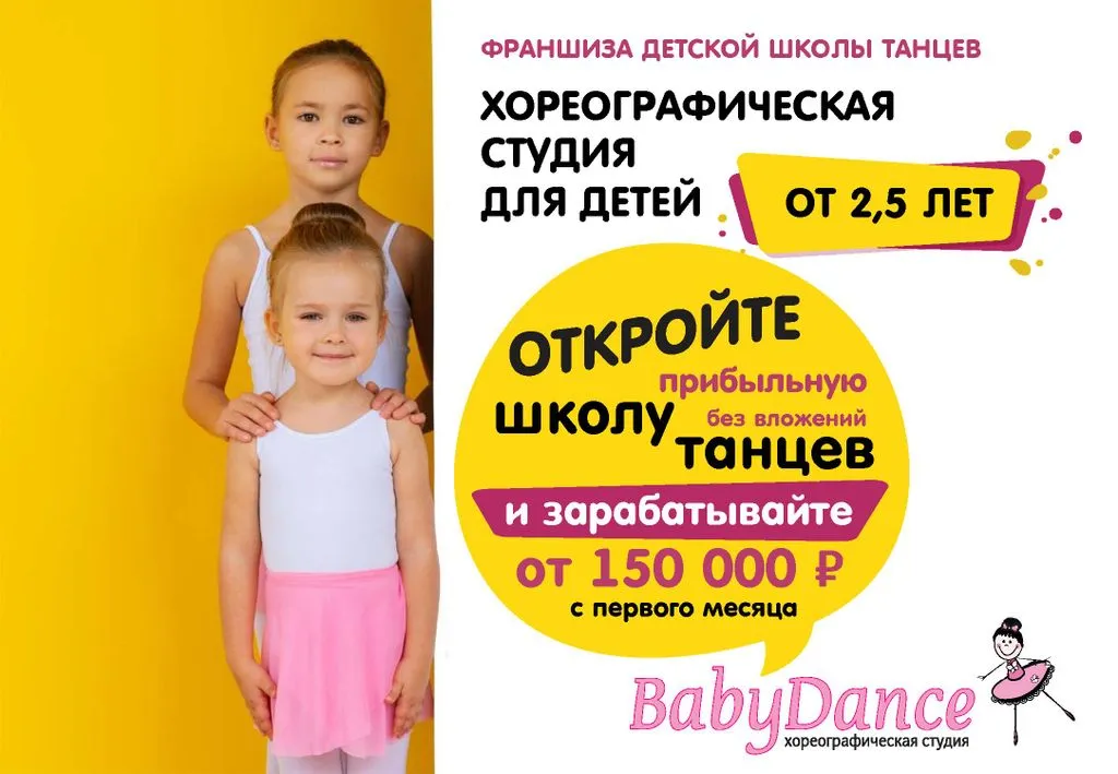 🎓 Франшиза BabyDance – это возможность открыть детскую хореографическую студию для детей от 2,5 лет с авторской программой и зарабатывать от 150 000 рублей чистой прибыли с первого месяца.
