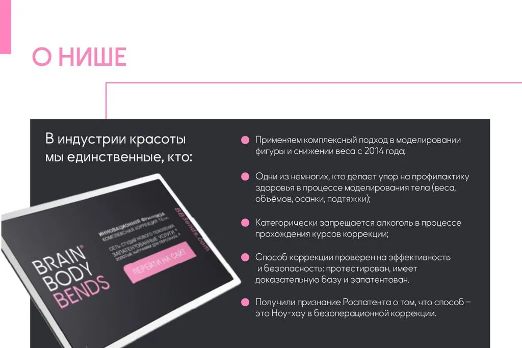 Мы делимся не только методикой коррекции фигуры, но и опытом в управлении персоналом. Наша стратегия «Золотые наручники» удерживает сотрудников в проекте на долгие годы, обеспечивая карьерный рост и системное обучение.