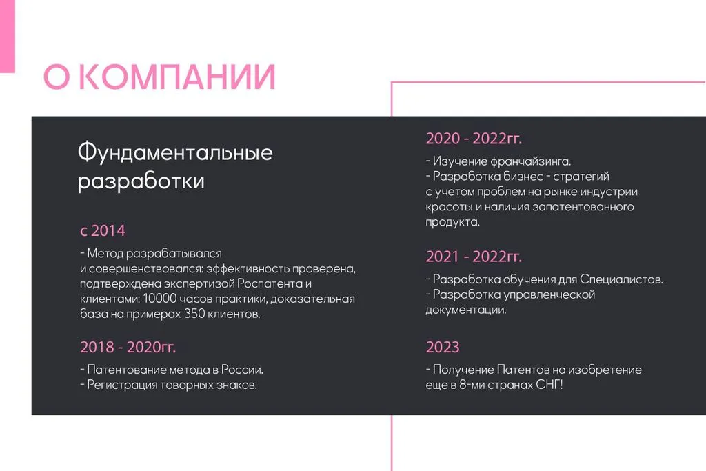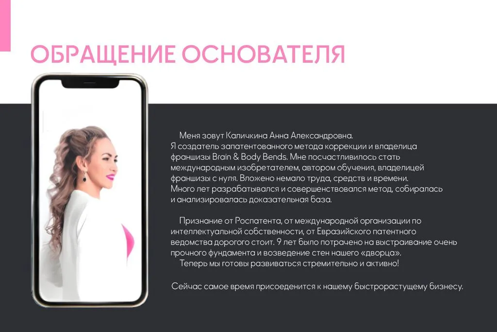 💡 Основатель компании, Анна Александровна Каличкина, прошла долгий путь обучения и разработала методику, которая доказала свою эффективность на более чем 350 пациентах. В 2020 году она получила патент в России, и теперь метод запатентован в 8 странах мира.