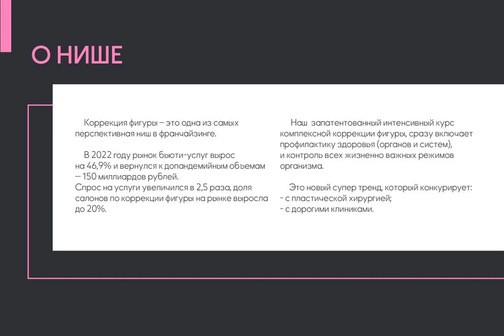 🔍 Коррекция фигуры — это перспективное направление в индустрии франчайзинга. В 2022 году рынок бьюти-услуг вырос на 46,9%, достигнув 150 миллиардов рублей, а спрос на услуги увеличился в 2,5 раза. Салоны по коррекции фигуры занимают 20% рынка.