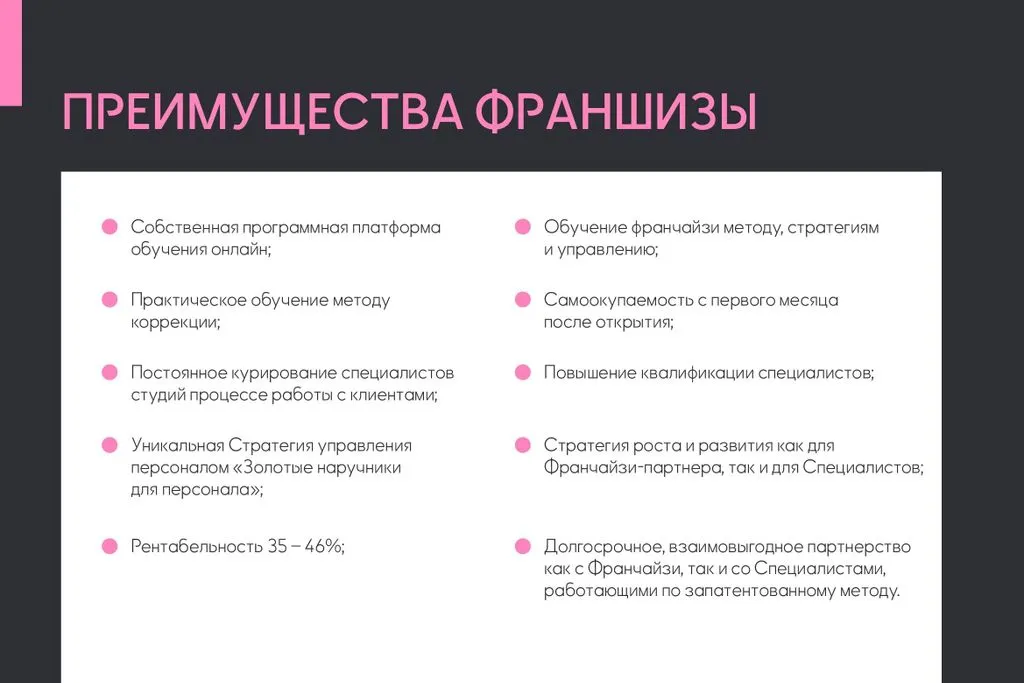 📈 В 2022 году мы начали развивать франчайзинг, чтобы как можно больше людей могли воспользоваться нашей методикой. Мы не только создали эффективную методику, но и автоматизировали все бизнес-процессы, что делает наш бизнес удобным и прибыльным для партнёров.