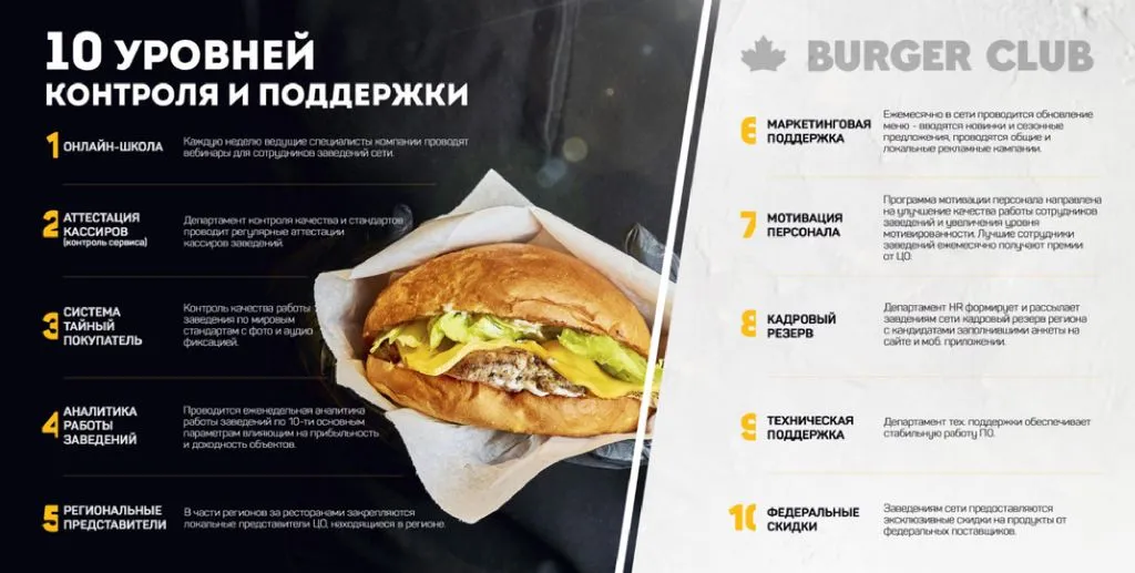 Франшиза BurgerCLUB — это отличная возможность стать частью успешного бизнеса с налаженной моделью работы. Компания предлагает своим партнёрам полную поддержку на всех этапах — от выбора места для ресторана до маркетинговых стратегий и обучения персонала. Благодаря популярности бренда и лояльной базе клиентов, франшиза позволяет быстро окупить вложения и начать получать прибыль. 💼