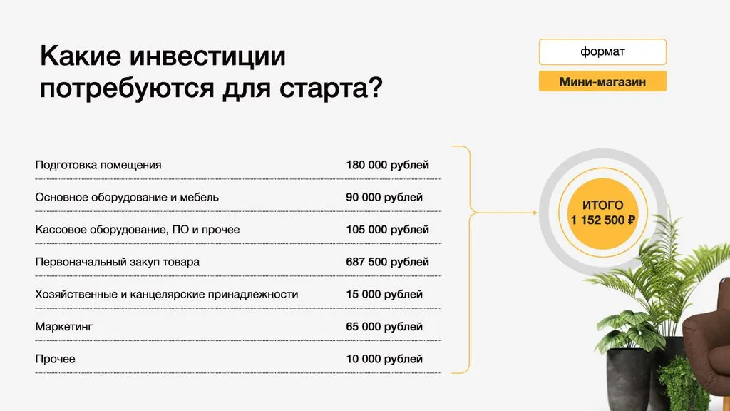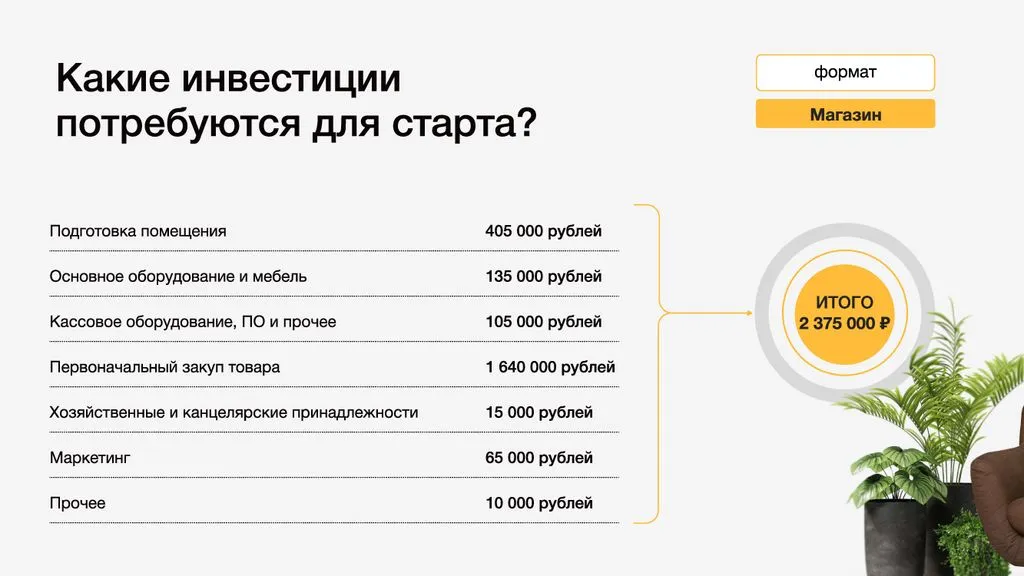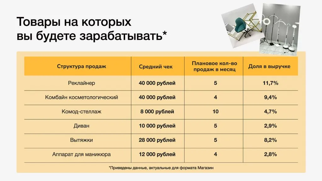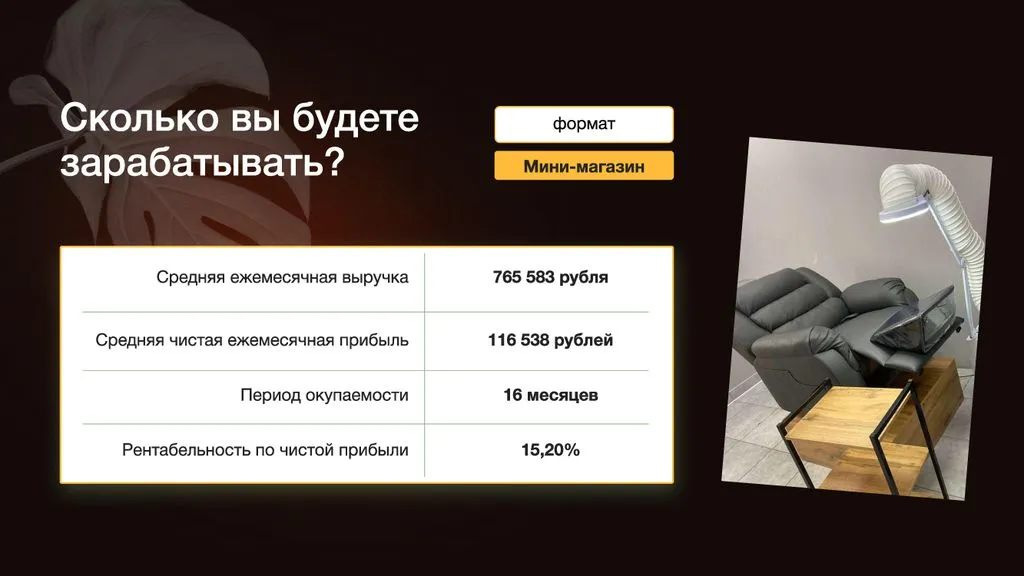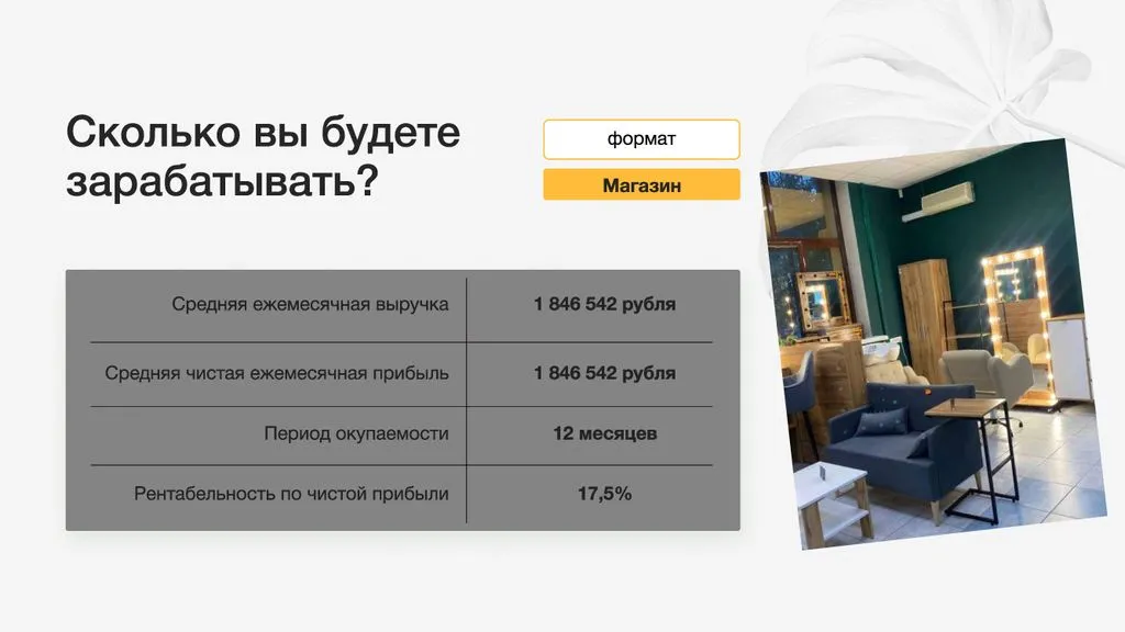 Помогаем найти помещение, собрать команду, сделать ремонт, получить товар по лучшим ценам, запустить рекламу и найти первых клиентов. Мы поддерживаем вас по всем вопросам и помогаем достичь финансовых показателей. 📈