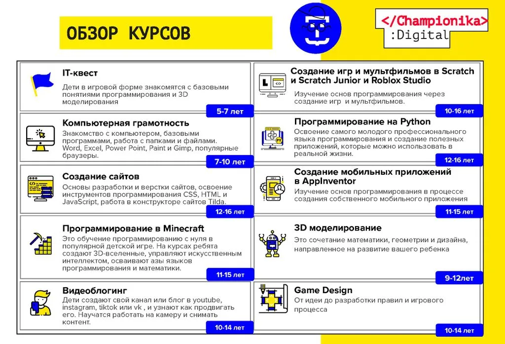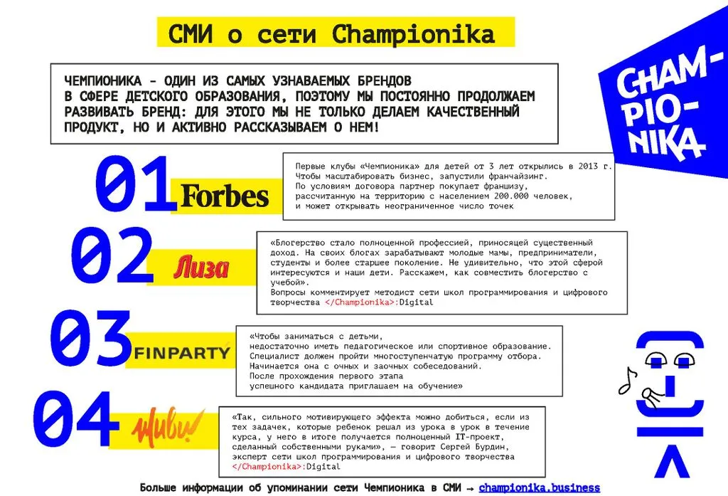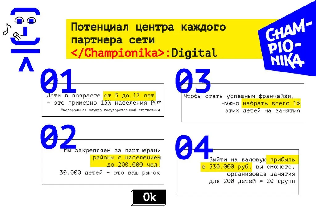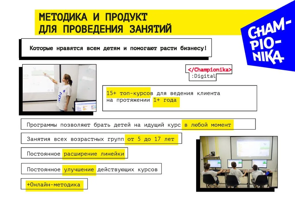 Championika Digital – это франшиза детского центра программирования и цифрового творчества от компании, которая заняла первое место по версии Forbes в 2018 и 2019 годах.