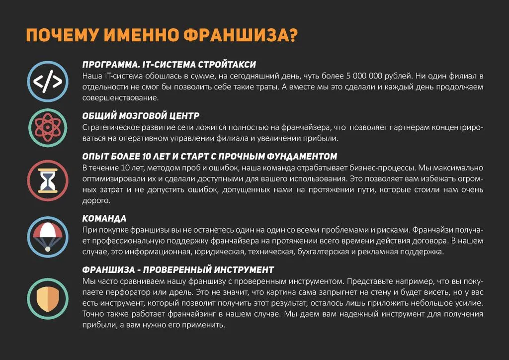 Мы ищем бизнес-партнеров, готовых работать на своей территории под нашим брендом, через нашу IT-систему и получать достойную прибыль. 💼