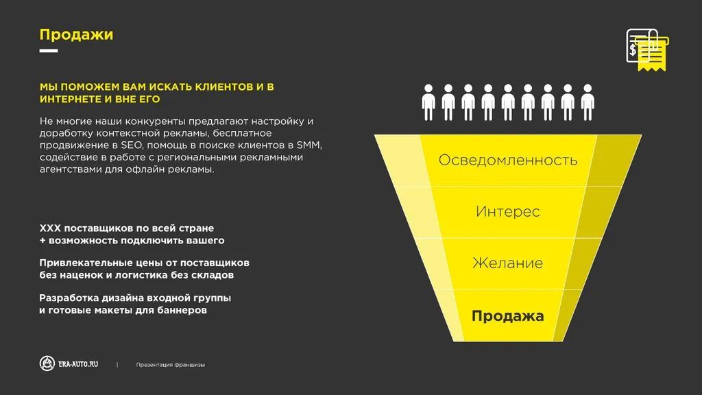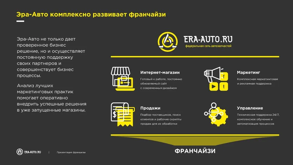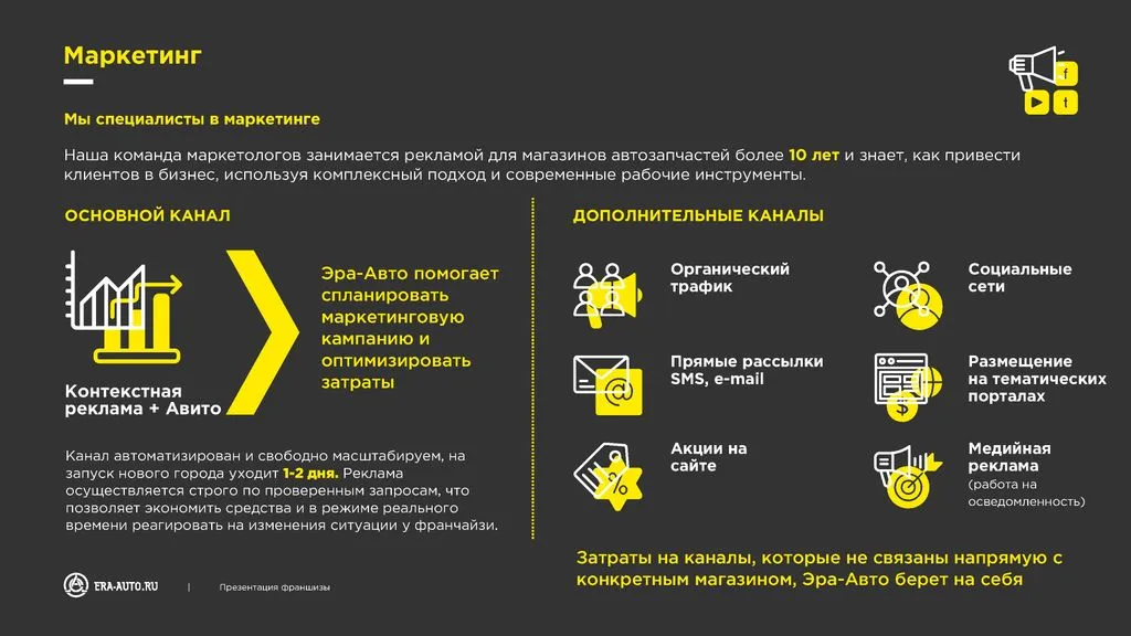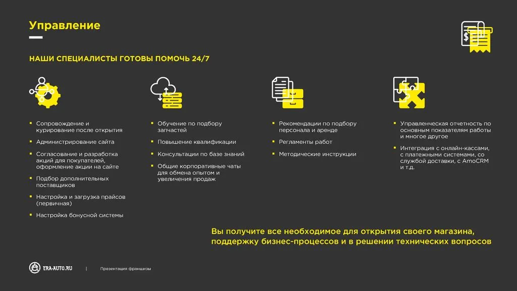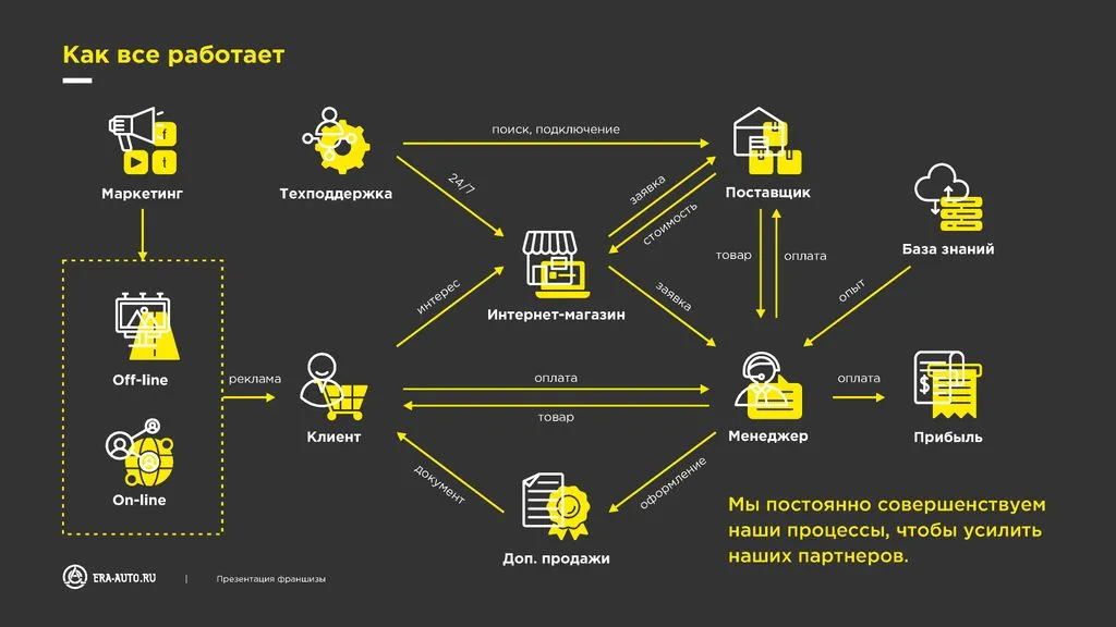 Мы предоставляем обучение, настройку рекламных кампаний и весь спектр услуг для запуска бизнеса. Ваша задача — только продавать и получать до 100% наценки на запчасти. Всё остальное сделаем мы.
