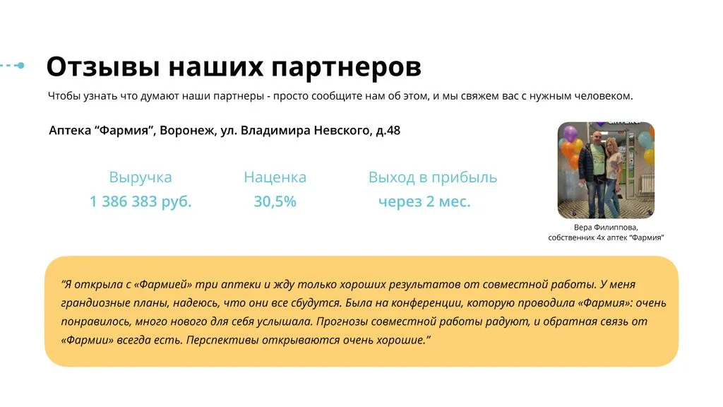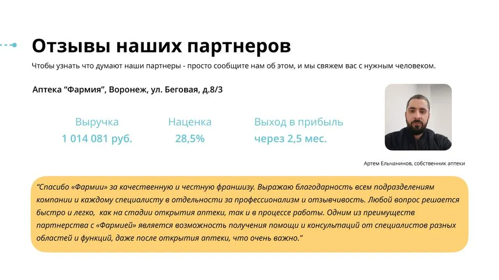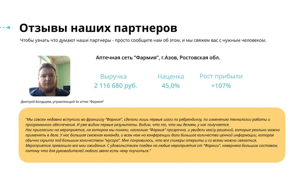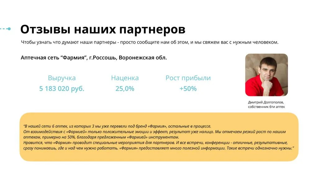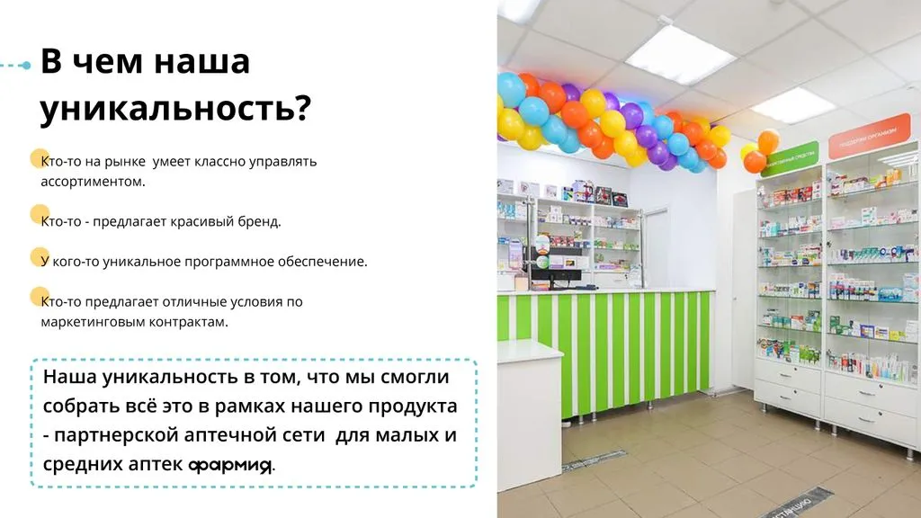 Наша уникальность в том, что «Фармия» смогла собрать всё это в рамках нашего продукта — партнерской аптечной сети для малых и средних аптек. 🤝🏪