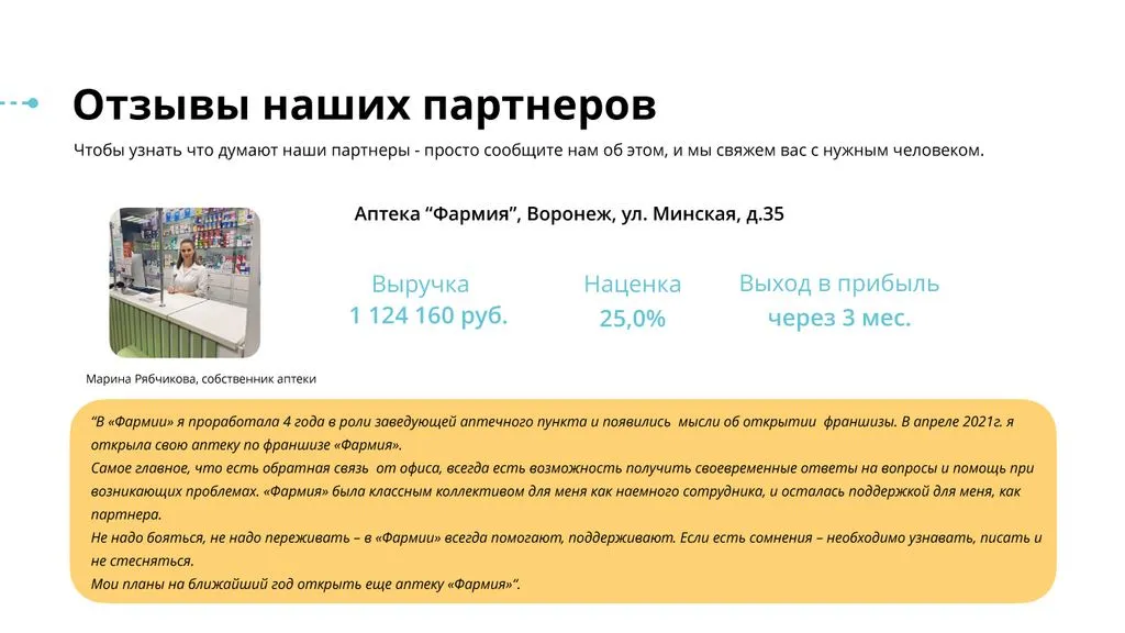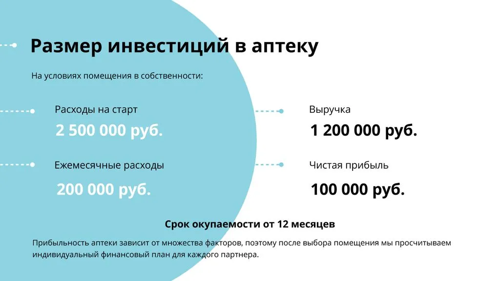 Средняя наценка в аптечных пунктах — около 25%. Таким образом, средний валовый доход составляет 240 000 рублей. 💵 Сумма чистой прибыли для франчайзи после вычета расходов на аренду, содержание помещения, заработную плату персонала и прочие расходы составляет в среднем 80 000 рублей. 💰