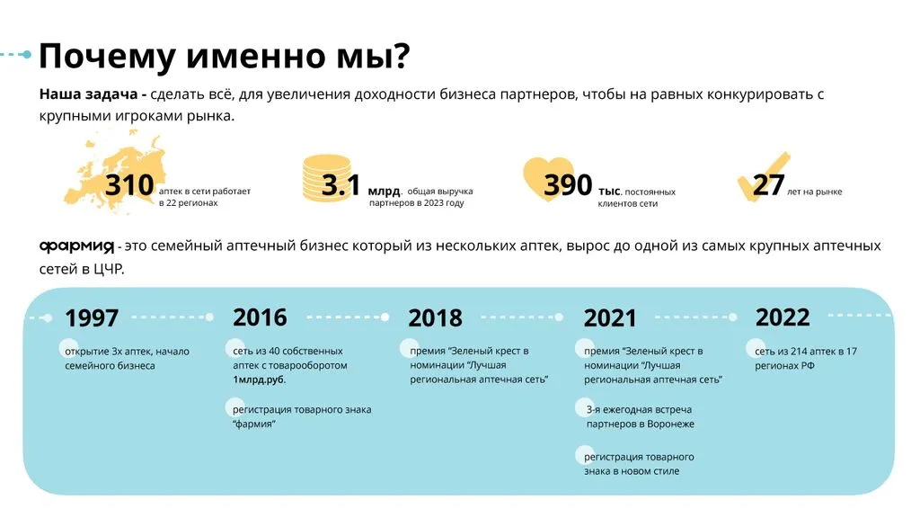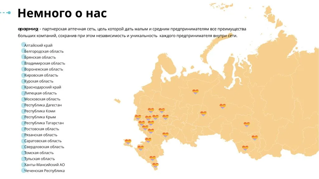 “Фармия” — это семейный аптечный бизнес, который вырос из нескольких аптек до одной из крупнейших аптечных сетей в Центрально-Черноземном регионе. Сейчас в нашей сети более 300 аптек в 22 регионах России. 🌍🏥