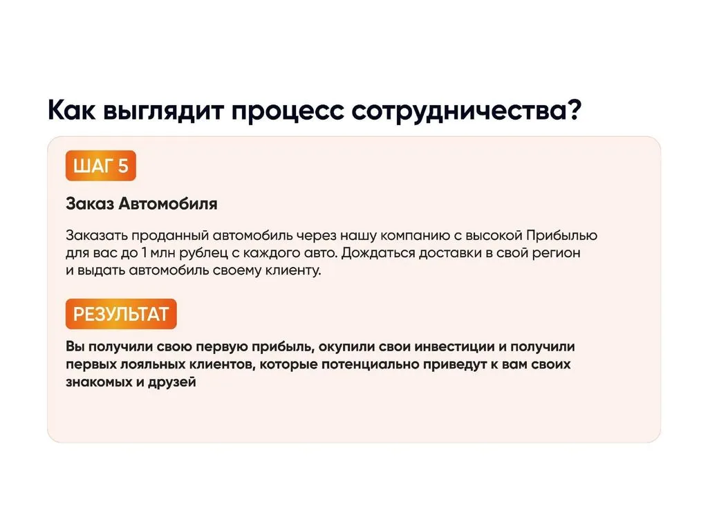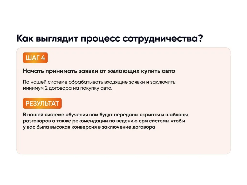 В нашей системе обучения вы получите скрипты и шаблоны разговоров с потенциальными покупателями, рекомендации по ведению CRM, сохранению высокой конверсии. Мы учим доводить клиента до сделки, а затем вы заказываете автомобиль и получаете прибыль в зависимости от марки – до 1 млн рублей с каждой продажи. 📈