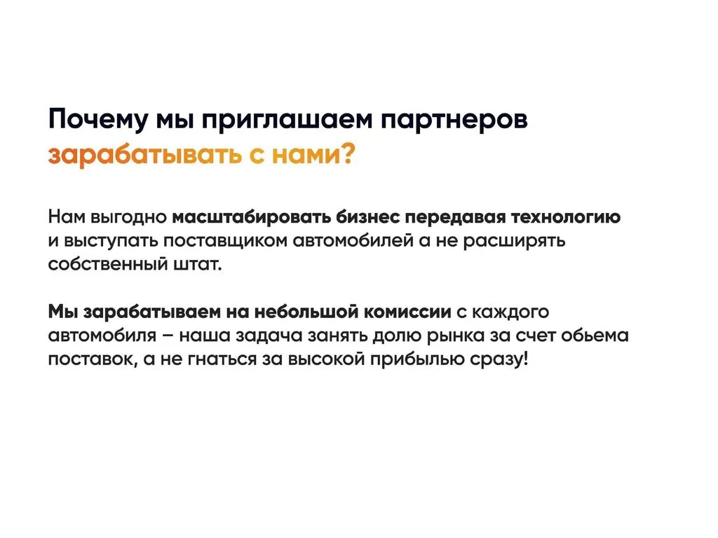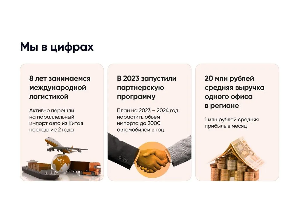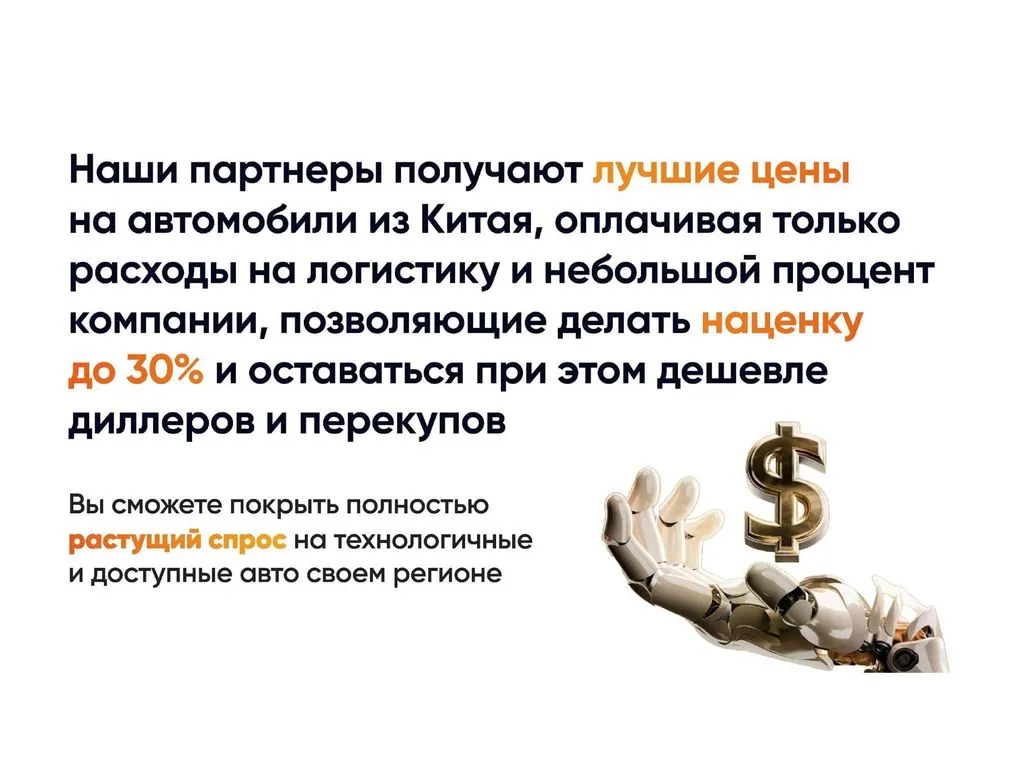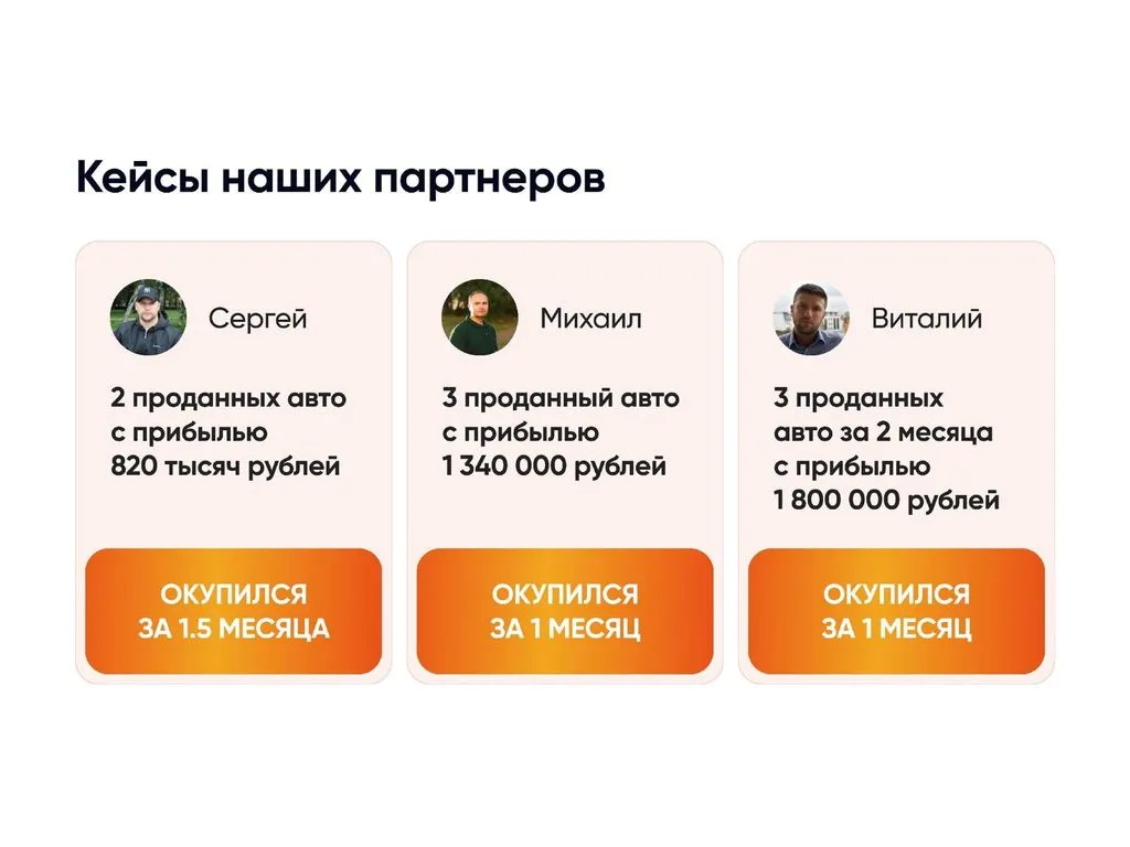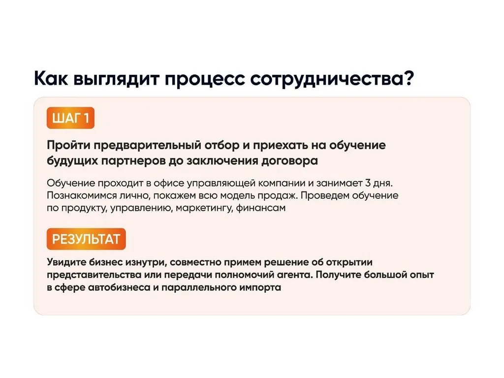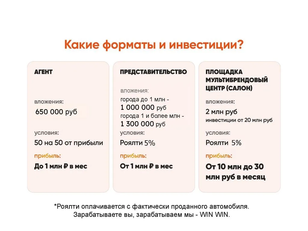 Сегодня мы ищем партнёров для расширения через франшизу. Теперь предприниматели из разных регионов могут воспользоваться нашим опытом, открыв представительство компании или став агентом и зарабатывая от 400 000 до 2 000 000 рублей с продажи одного автомобиля. 💰
