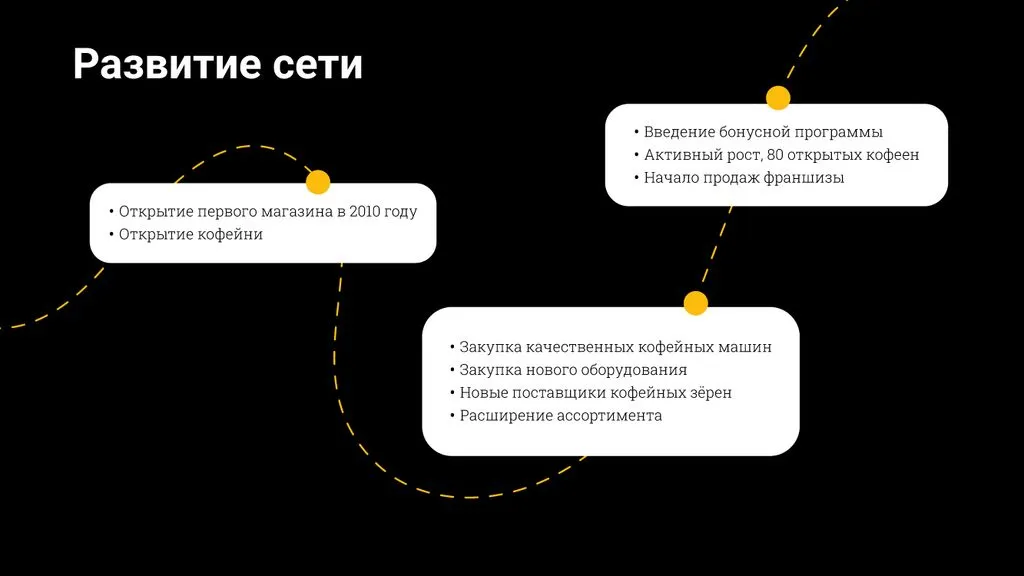 Вскоре мы открыли первую кофейню и расширили меню: добавили сэндвичи, выпечку, десерты и премиальный кофе из 100% арабики. На волне успеха мы увеличили производство и начали открывать новые фирменные точки по всей Москве. 🏙️