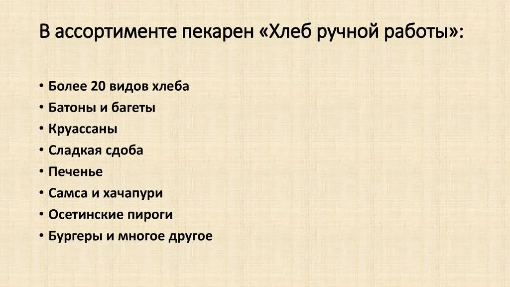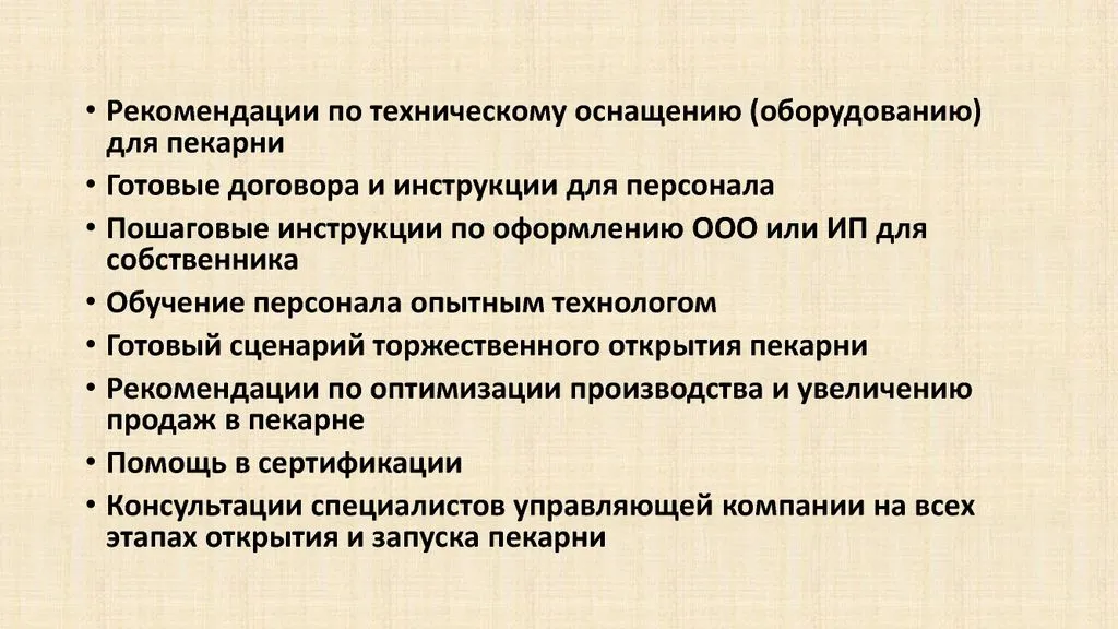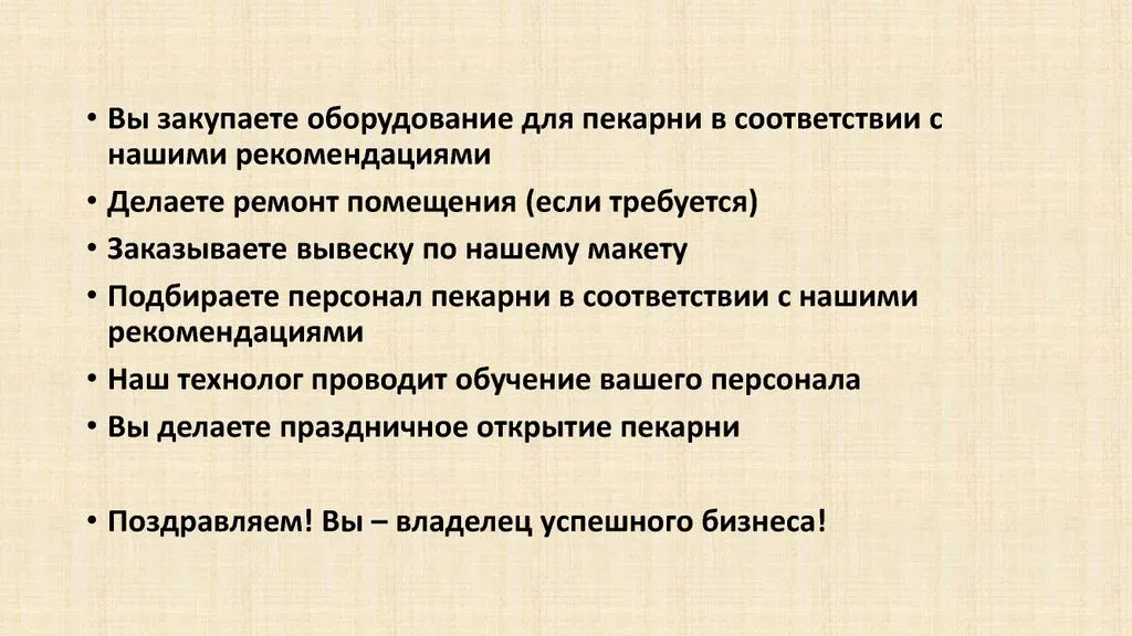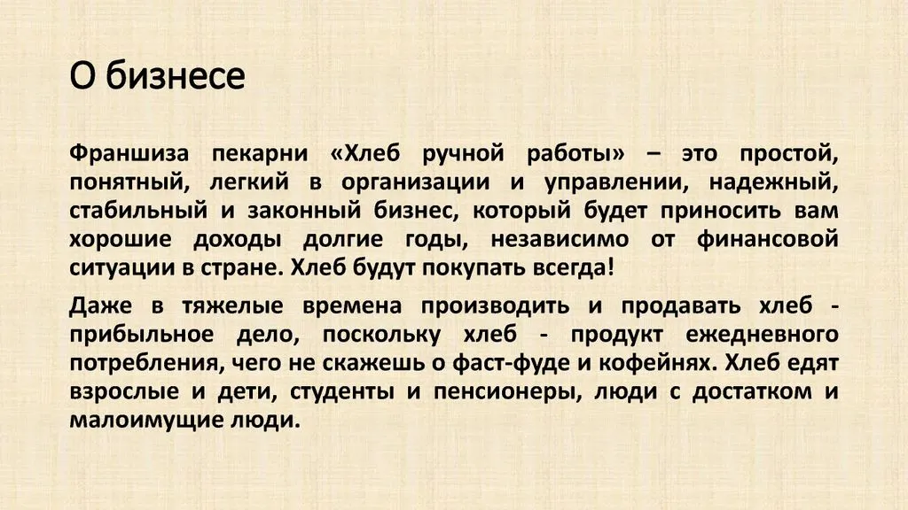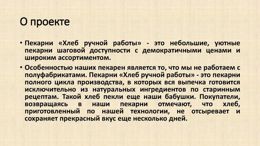 Опыт и знания, полученные в других франчайзинговых проектах и пекарнях собственной сети, компания готова передать своим партнерам в сети пекарен «Хлеб ручной работы» 🥖.