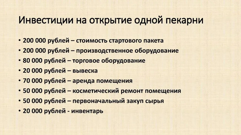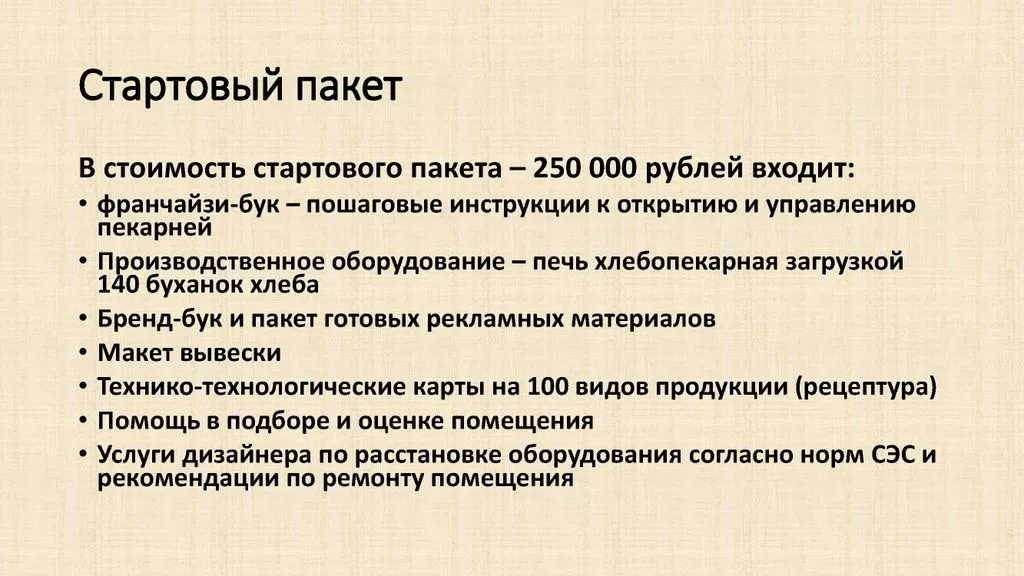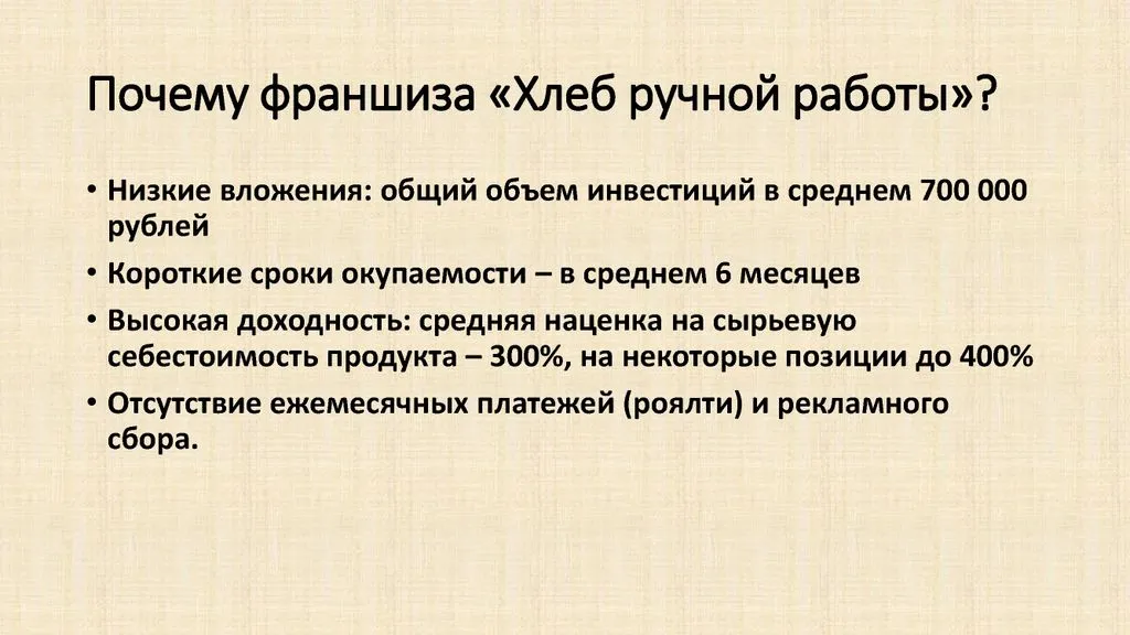 Стоимость франшизы — 400 000 рублей, общие инвестиции на открытие одной пекарни — от 850 000 рублей 💸, а срок окупаемости — от 3 месяцев .