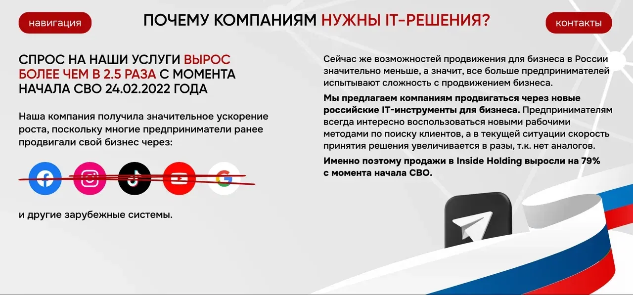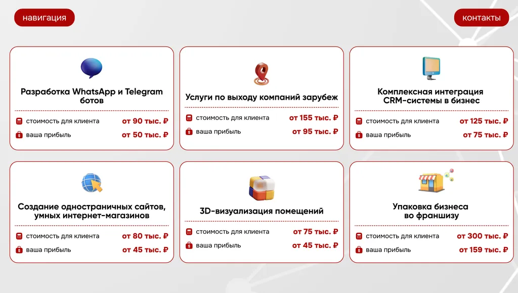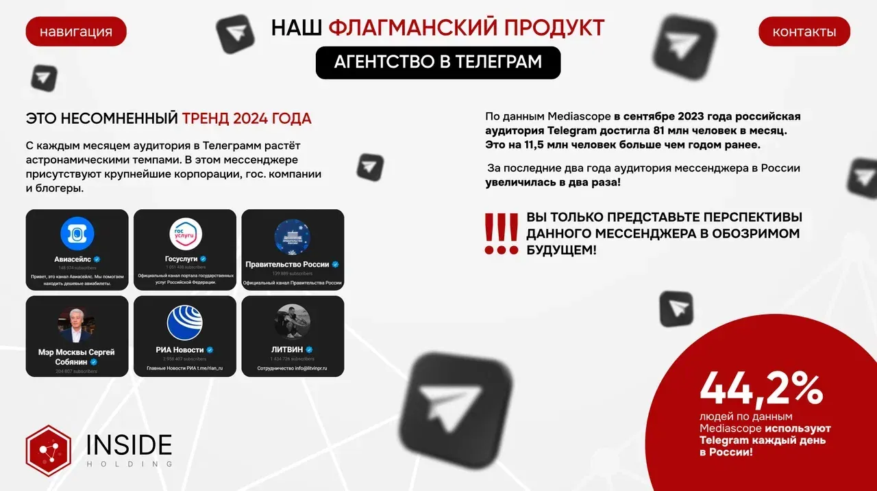 Inside Holding предоставляет предпринимателям уникальные IT-решения, которые помогают эффективно развивать бизнес, такие как 3D-визуализация, идентификация пользователей и многое другое. Эти услуги приносят постоянную прибыль, так как клиенты платят вам ежемесячно.