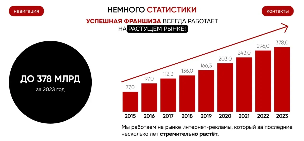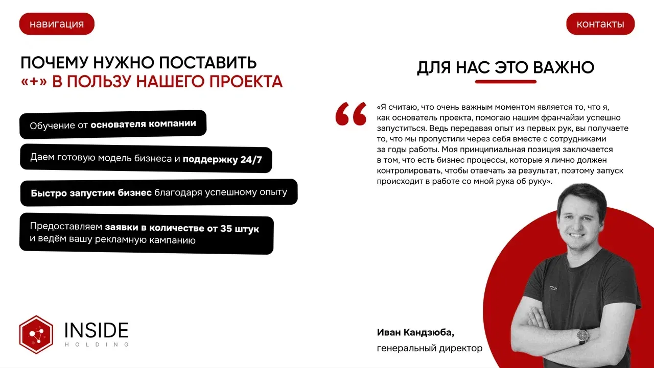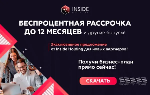 Франшиза Inside Holding позволяет работать из любой точки мира, не опасаясь кризисов. Мы предоставляем предпринимателям возможность получать клиентов через интернет. Более того, мы предлагаем беспроцентную рассрочку на оплату франшизы до 12 месяцев!