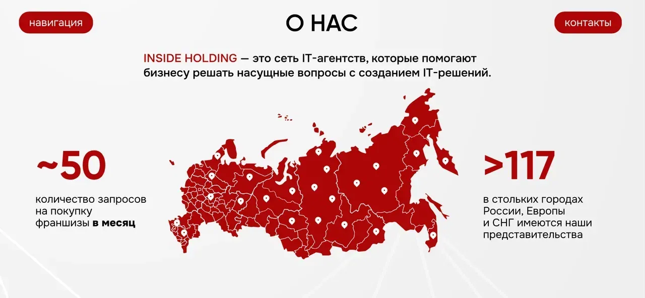 Inside Holding успешно развивает цифровой рынок благодаря качественным IT-решениям для бизнеса. Всего за четыре года мы выросли из небольшого агентства в международную сеть с 117 филиалами в 8 странах. Мы поддерживаем каждого партнёра и гарантируем возврат вложенных средств, если наш партнёр не достигает результата, следуя нашим инструкциям.