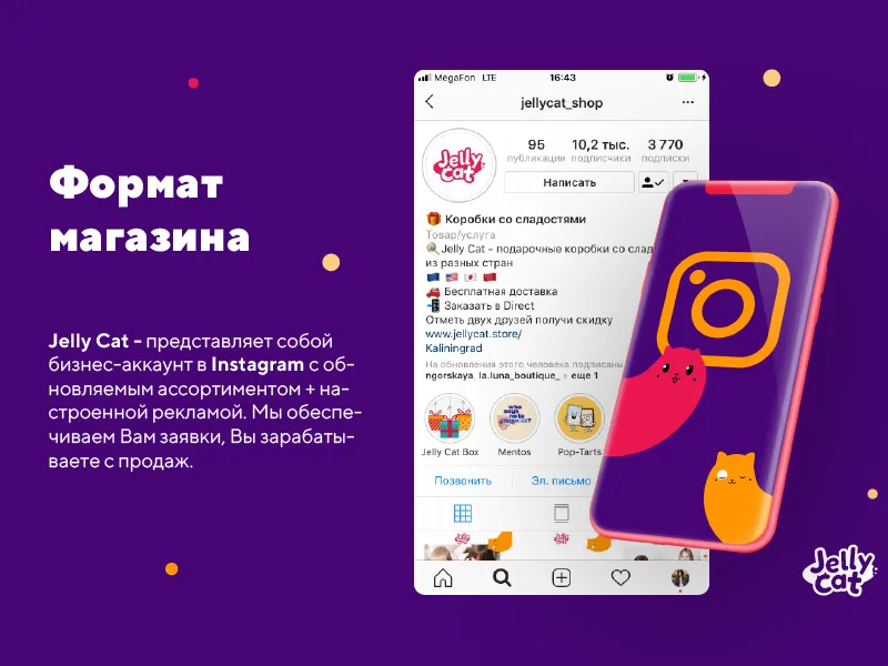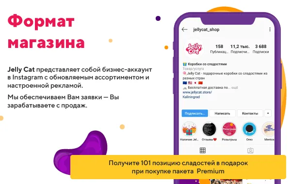 Jelly Cat – это популярный интернет-магазин, специализирующийся на продаже подарочных боксов и сладостей со всего мира. Основная цель компании – создавать радость и эмоции через уникальные сладкие подарки. Бренд активно работает на платформе Instagram, привлекая аудиторию через яркие и креативные предложения.