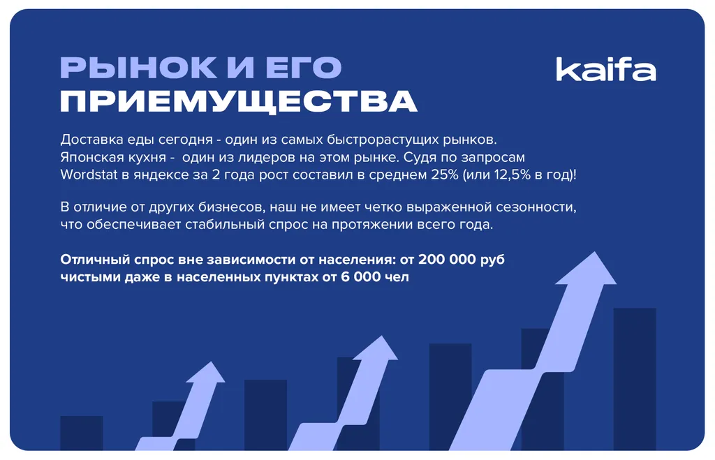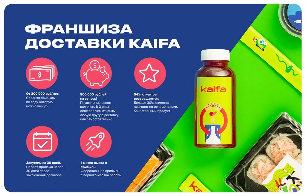 Франшиза «Доставка Kaifa» — одна из самых доступных и быстроокупаемых в сфере доставки суши и роллов 🍣. Мы гарантируем возврат инвестиций и возможность зарабатывать до 600 000 рублей в месяц!