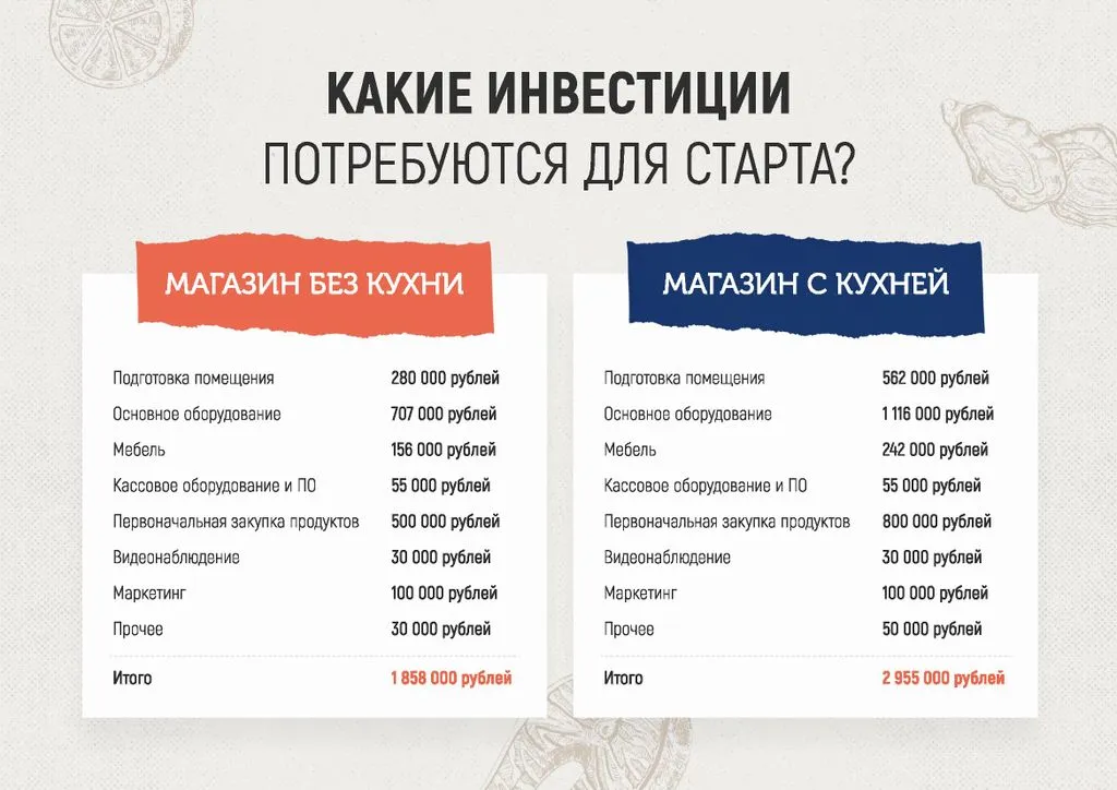 Преимущества:Мы предлагаем два формата: магазин без кухни (только продажа разливных напитков, морепродуктов и снеков) или магазин с кухней, где акцент сделан на приготовлении рыбы и раков в собственной коптильне и раковарне. Вне зависимости от выбранного формата, вы получите всё необходимое для быстрого старта и успеха! 🏆