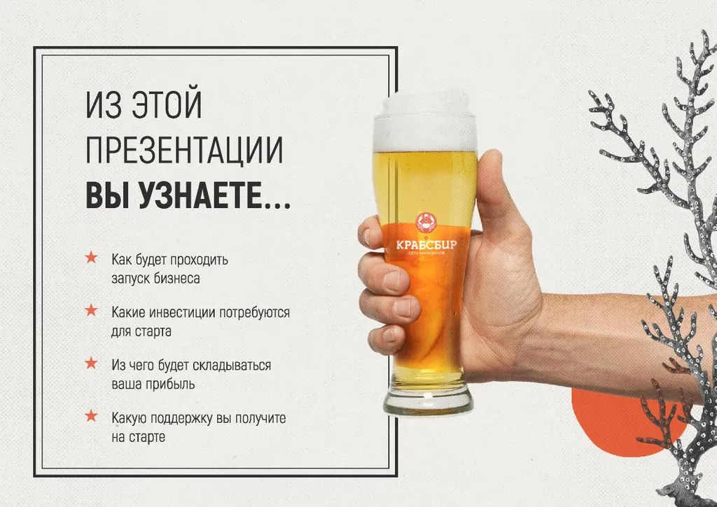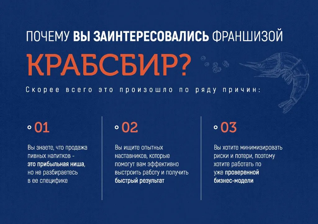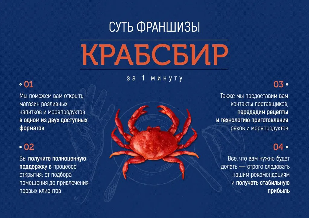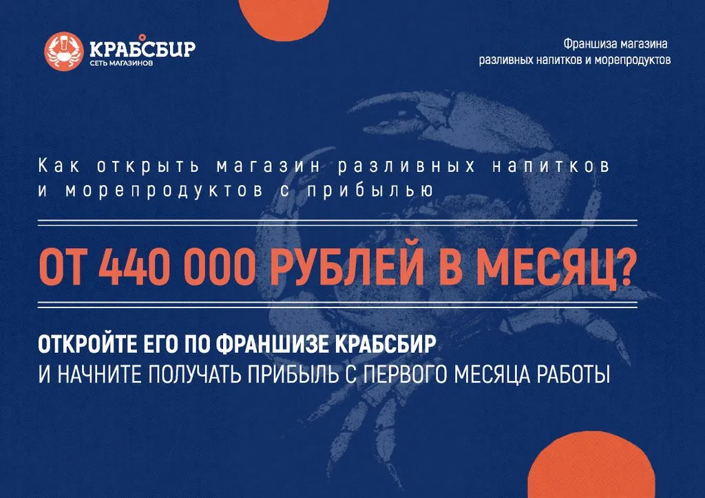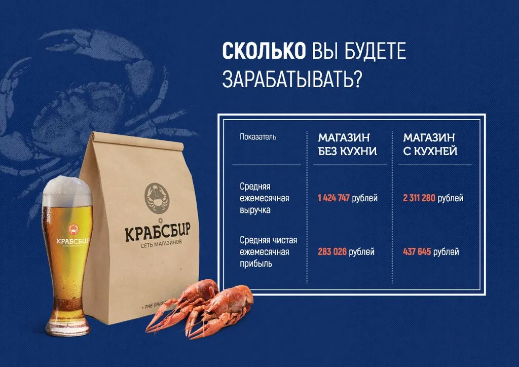 Франшиза КРАБСБИР — это возможность открыть фирменный магазин разливных напитков и морепродуктов с чистой прибылью от 150 000 до 300 000 рублей в месяц. 🔥