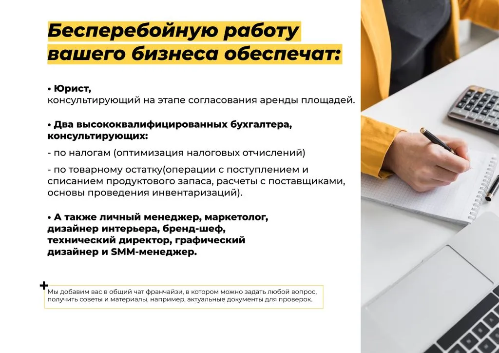 Ежемесячно вы будете получать полный спектр услуг: от маркетинга и SMM до бухгалтерии и цифровой платформы обучения. Мы поможем вам с кредитами, инвестициями и всеми другими вопросами.