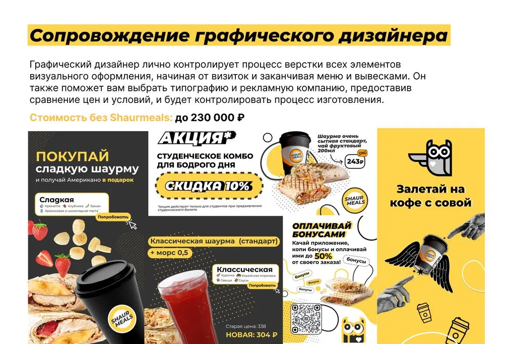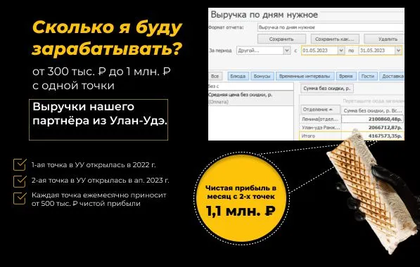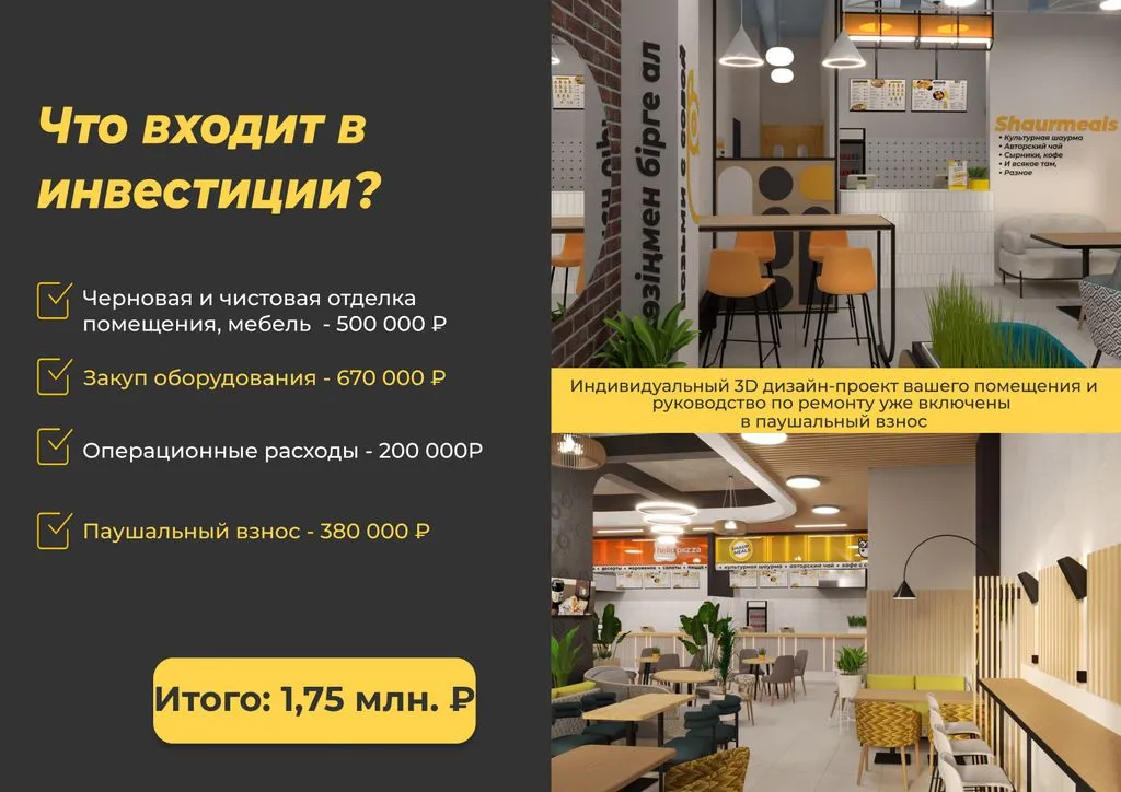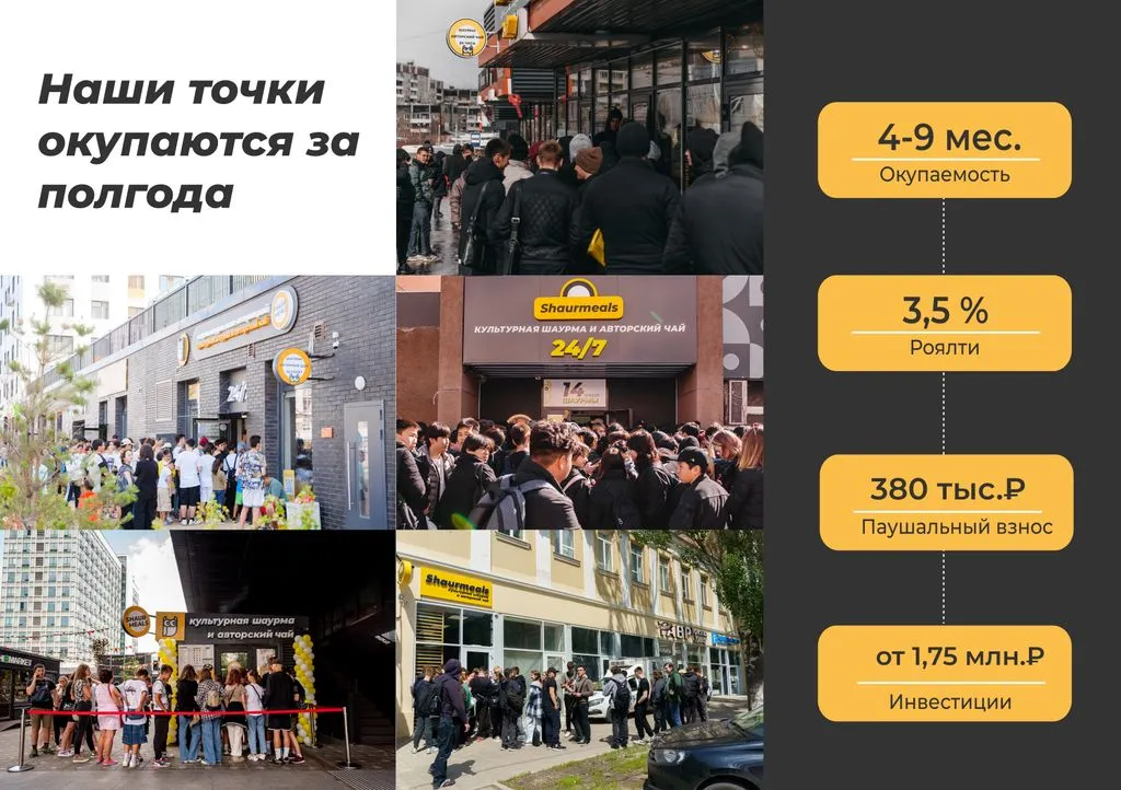 Средняя выручка одной точки ShaurMeals, работающей больше года, составляет 65 000 ₽ в сутки. Это около 1 950 000 ₽ в месяц. После вычета всех расходов, таких как foodcost (780 000 ₽), зарплата сотрудников (350 000 ₽), аренда (150 000 ₽) и другие — чистая прибыль составляет 517 500 ₽ в месяц!