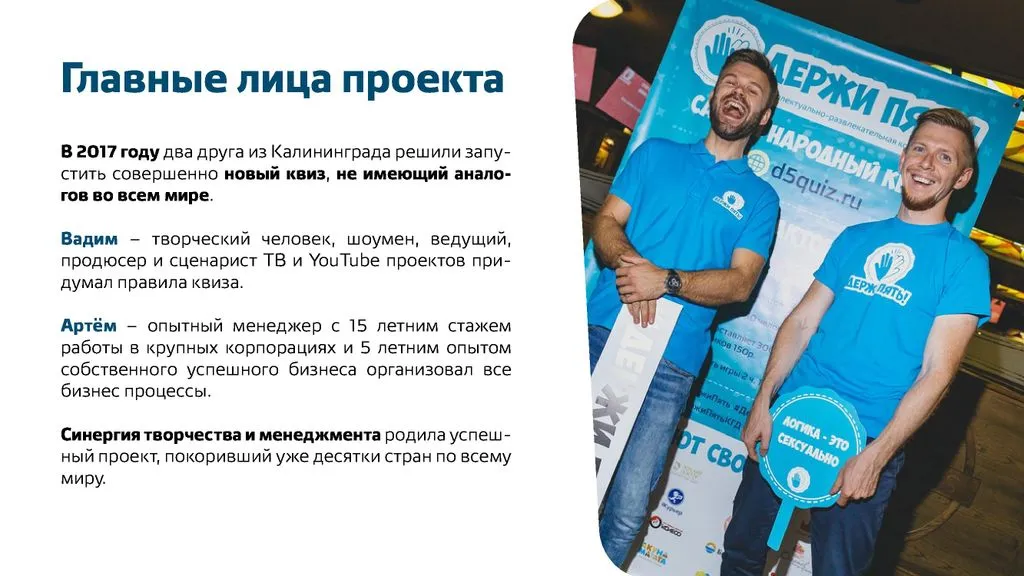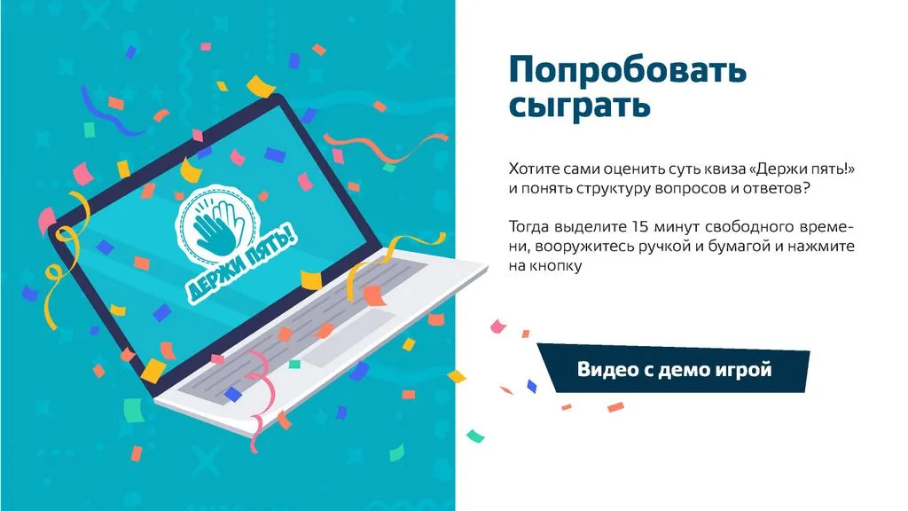 Мы ищем энергичных и открытых людей, готовых создать интересный проект и относиться к нему серьезно. «Держи Пять!» — это игра, дарящая улыбки, и мы хотим, чтобы наш партнер полюбил проект так же, как любим его мы. 😊