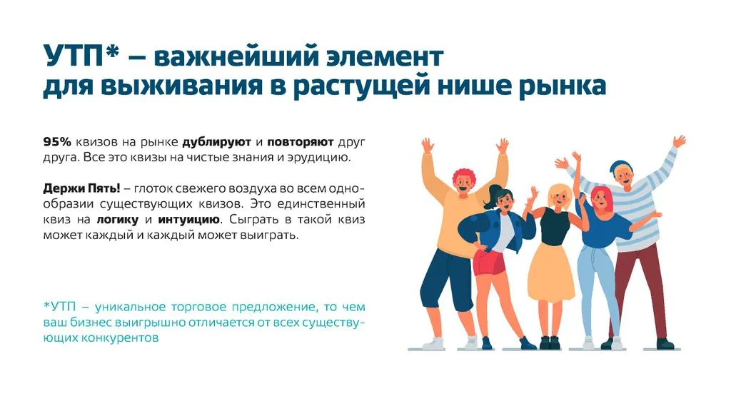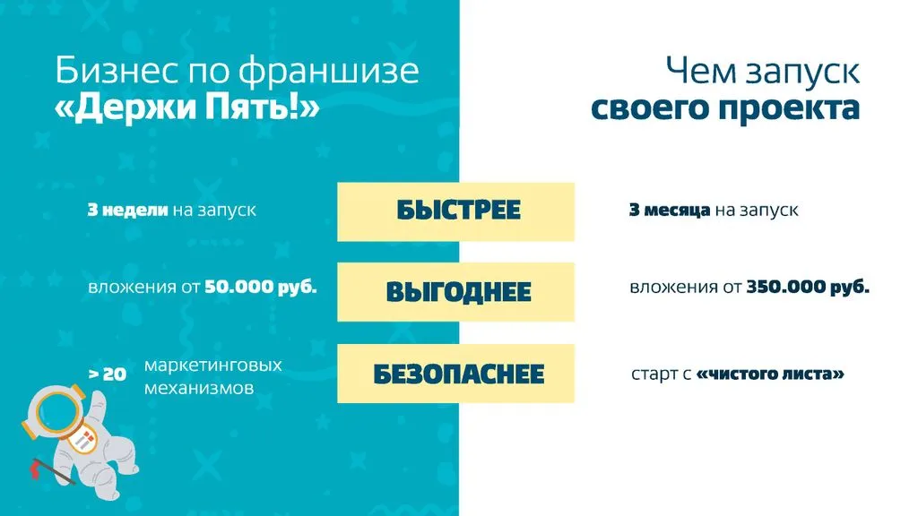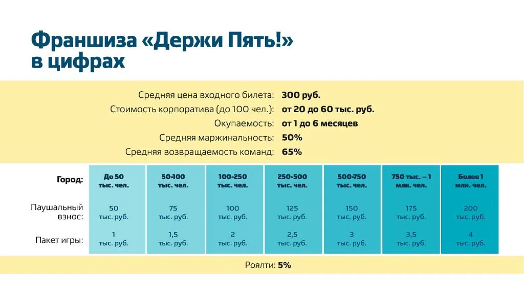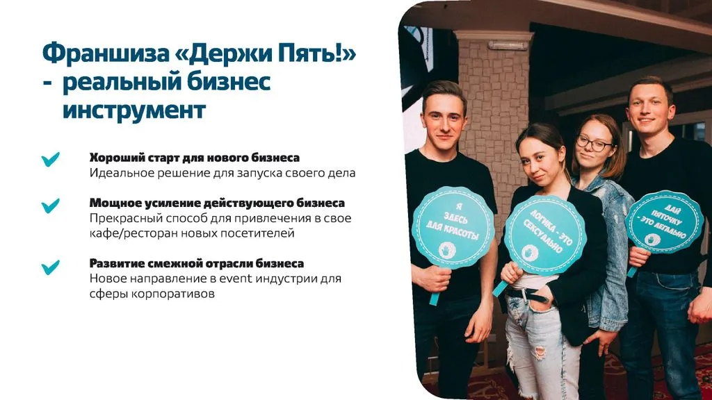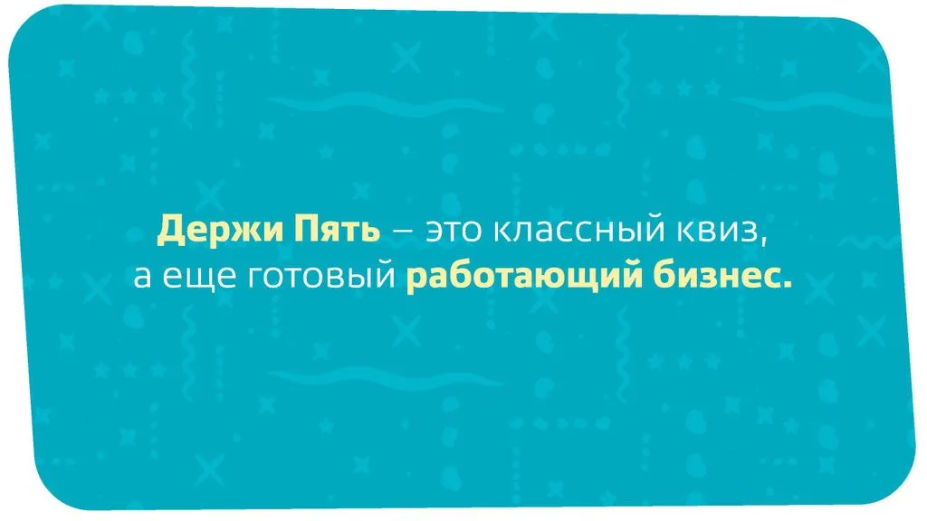 Чтобы начать квиз «Держи Пять!», не требуются НИКАКИЕ капитальные вложения. 💸 Вам не нужно арендовать помещение, заказывать вывески, нанимать постоянных сотрудников или получать лицензии. ✅