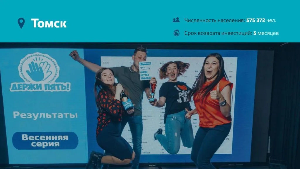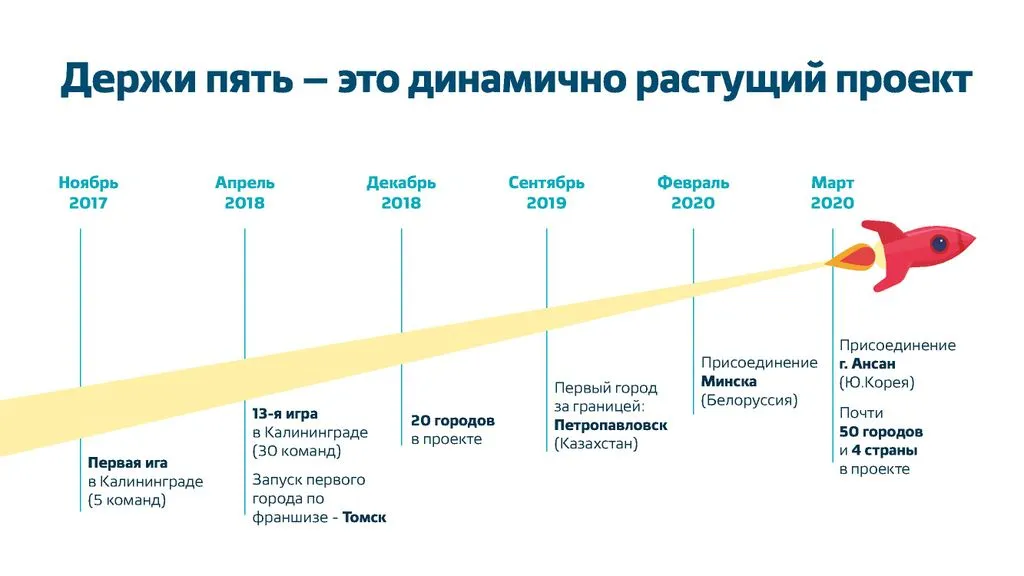 Наш проект стремительно растет: каждую неделю к семье «Держи Пять!» присоединяется новый город! 🏙️ Наш успех заключается в простоте и доступности для всех, а также в дружелюбной и веселой атмосфере. 😊 Подходит для любителей интеллектуальных игр, веселых компаний, семейных посиделок и тех, кто любит азарт. 🕺💃