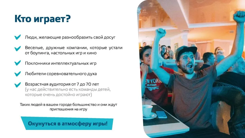 Это интеллектуально-развлекательная игра, в которую могут играть все — от 7 до 70 лет. 👶👵 Никаких возрастных ограничений и деления на группы — все играют на равных условиях.