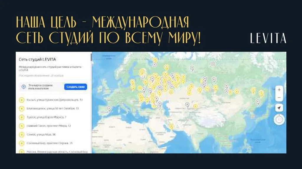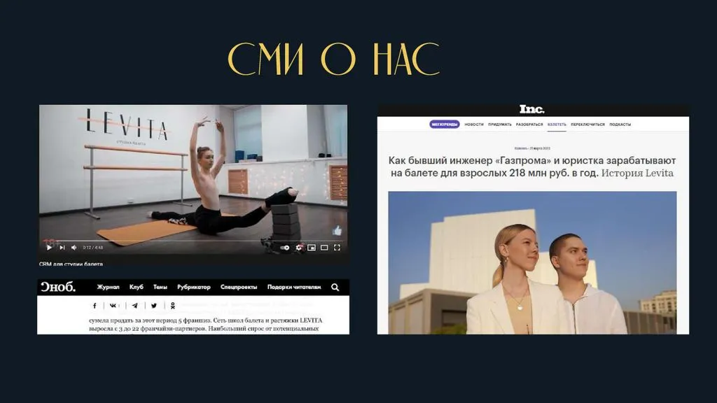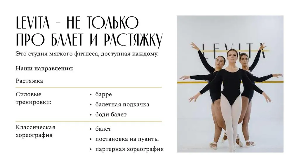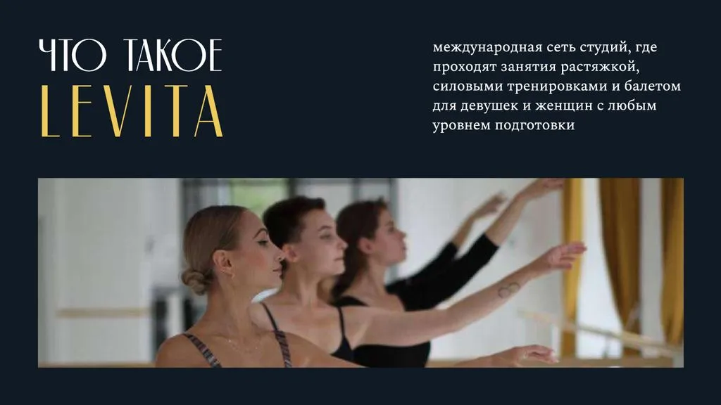 LEVITA — это международная сеть студий балета и растяжки, предлагающая уникальные программы тренировок, которые сочетают классический балет с современными методиками развития гибкости. Компания начала свою деятельность с целью создания пространства для всех, кто мечтает овладеть искусством балета и улучшить свою физическую форму через растяжку. 💃