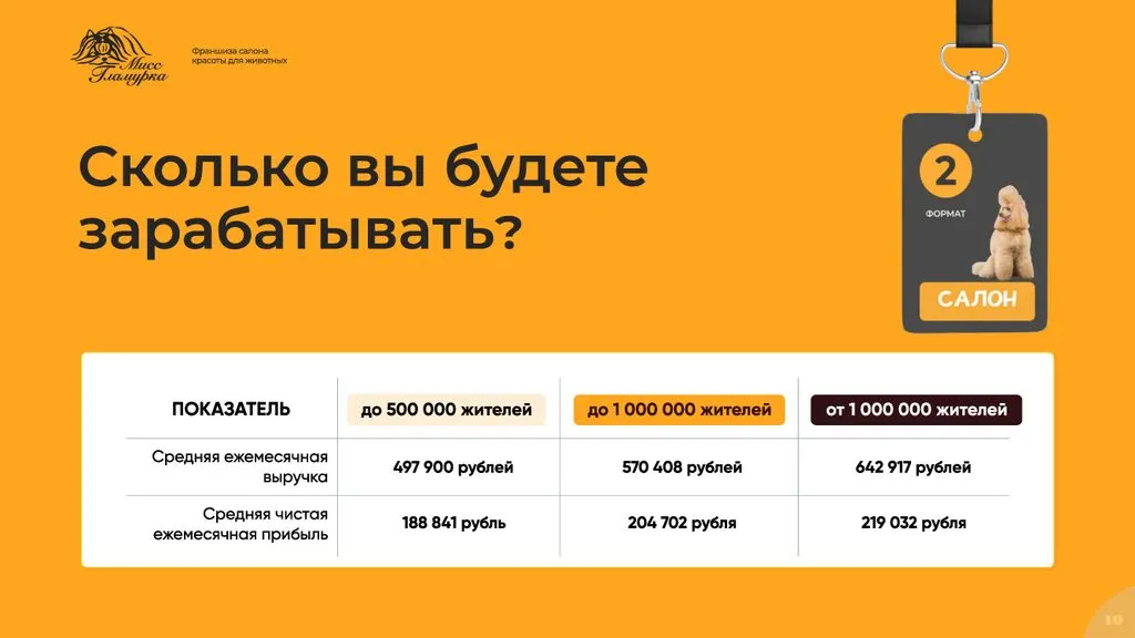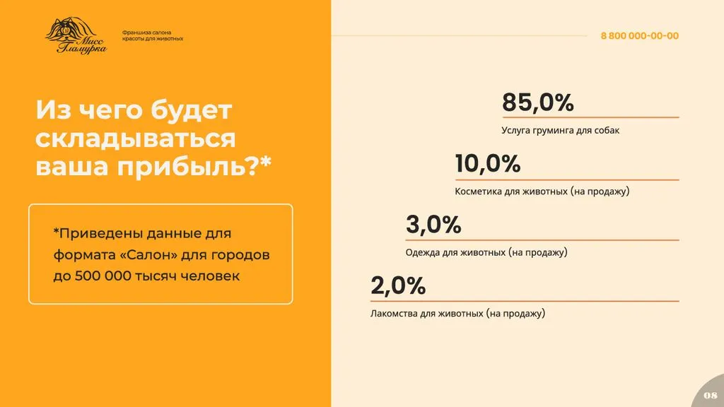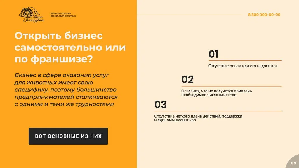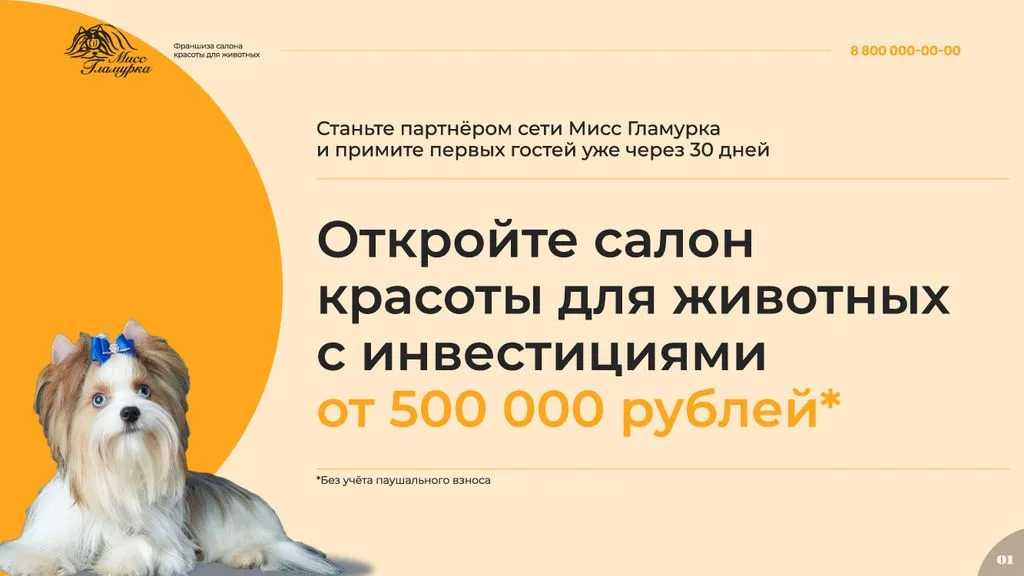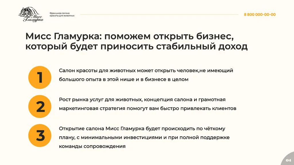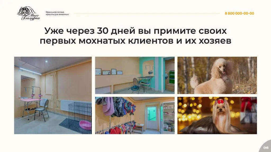 Франшиза «Мисс Гламурка» — это отличная возможность открыть собственный груминг-салон под известным брендом. 🚀 Мы предоставляем полную поддержку на всех этапах открытия и ведения бизнеса, от обучения и консультаций до маркетинговой и рекламной поддержки. Станьте частью успешной и развивающейся сети!» 🌟