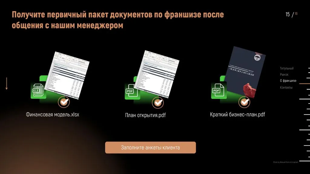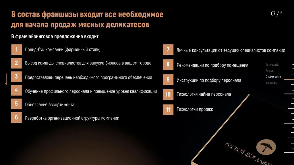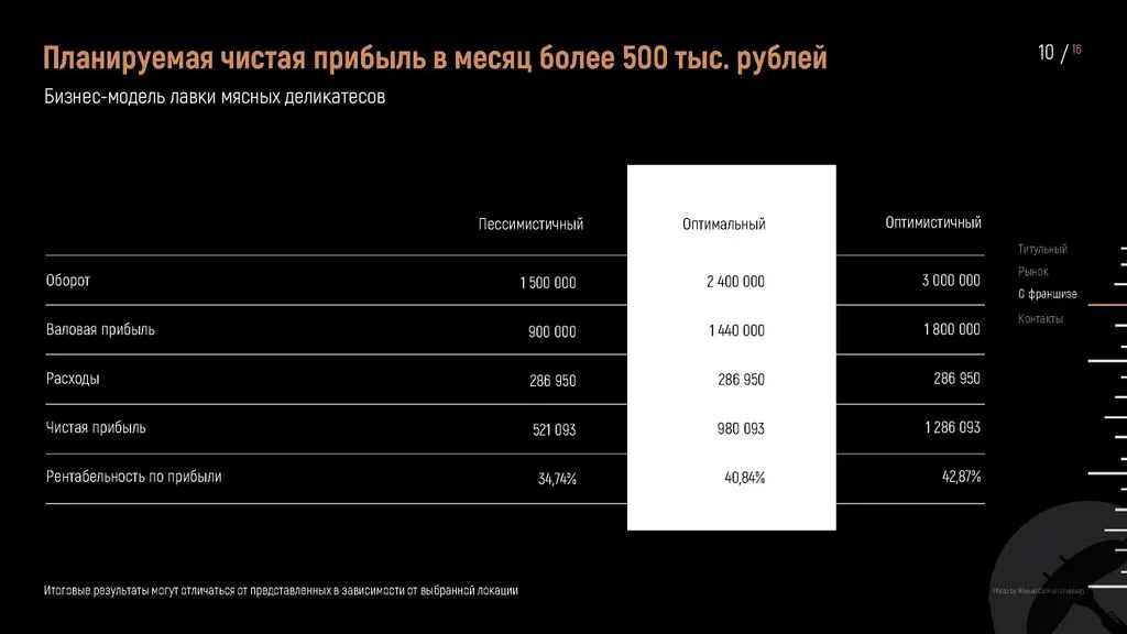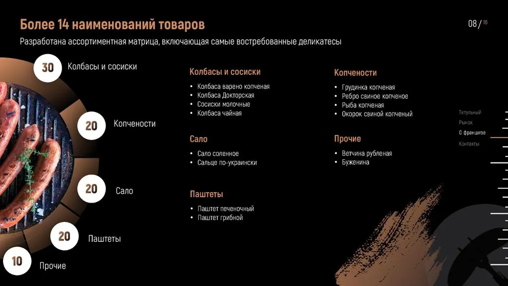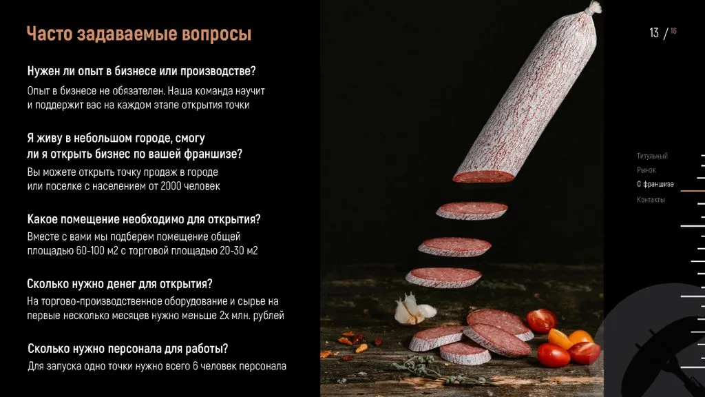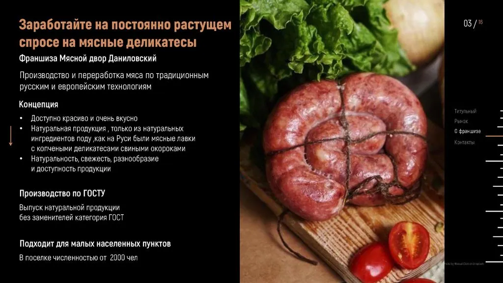 У нас нет прямых конкурентов. 👍 Рынок стабилен, спрос на мясные деликатесы постоянен, а наш формат подходит для городов с населением от 2 000 человек. 🌍