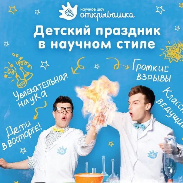 "Научное шоу Открывашка" представляет собой образовательные программы, основанные на проведении интересных и познавательных научных экспериментов. Эти шоу направлены на развитие у детей и подростков интереса к науке и технологиям через развлекательные и визуально привлекательные демонстрации.