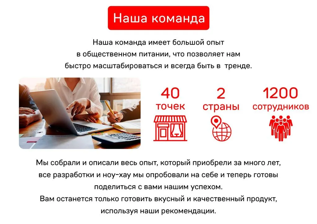 👨🏫 Мы предлагаем полное сопровождение с момента подписания договора ДО и ПОСЛЕ открытия. Наши специалисты всегда готовы помочь — от поиска помещения до обучения персонала. Мы лично приезжаем на открытие точки, чтобы гарантировать, что всё соответствует стандартам компании. Бренд-шефы обучают поваров, чтобы каждая деталь была учтена.