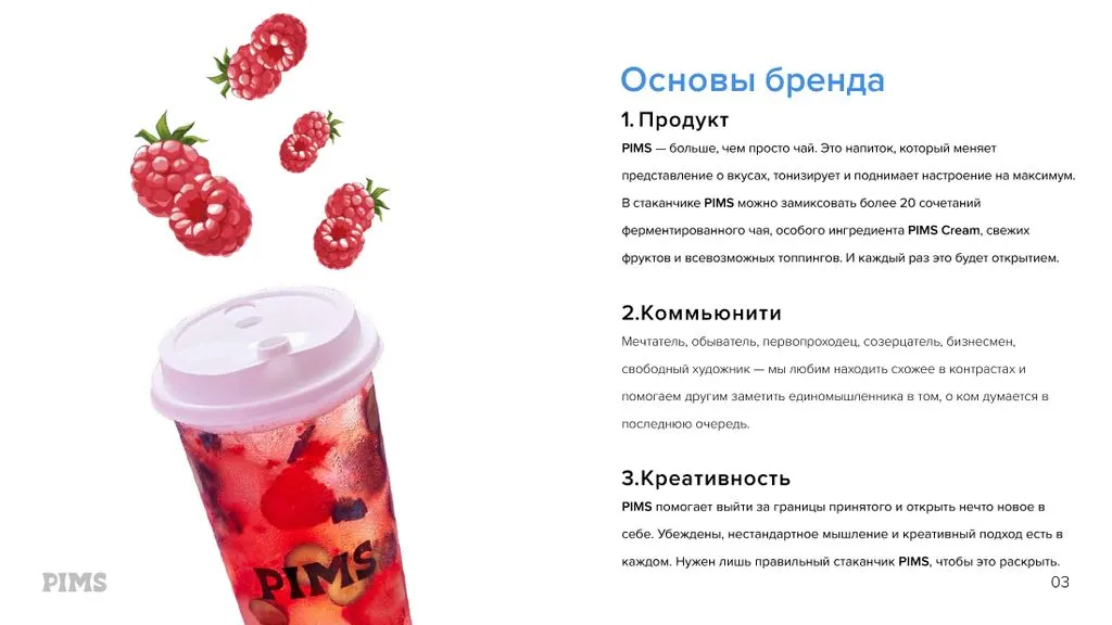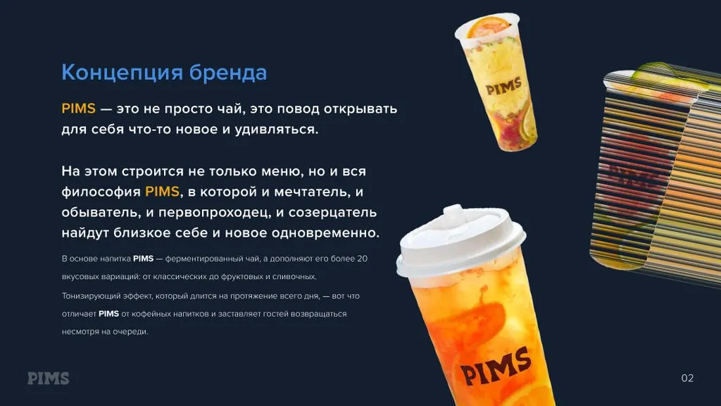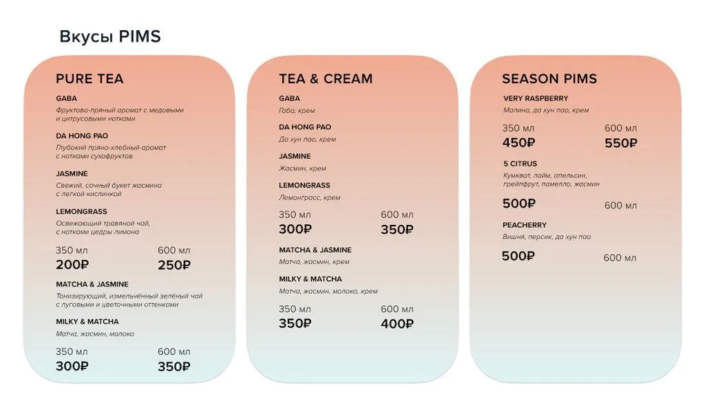 🌿 **PIMS** — бренд эксклюзивных напитков на основе ферментированного чая, дополненный более чем 20 уникальными вкусами — от классических фруктовых до сливочных. 😋 Энергетический эффект от наших напитков длится весь день!