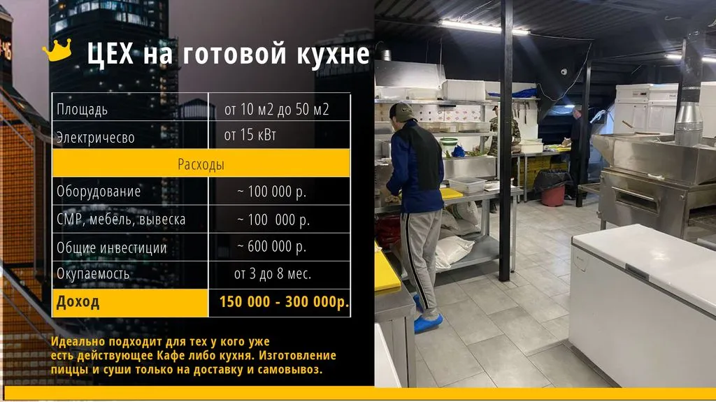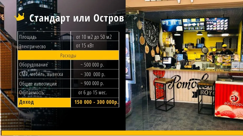 Мы предлагаем 4 формата: от мини-островка и стандартного кафе до запуска цеха, работающего только на доставку.