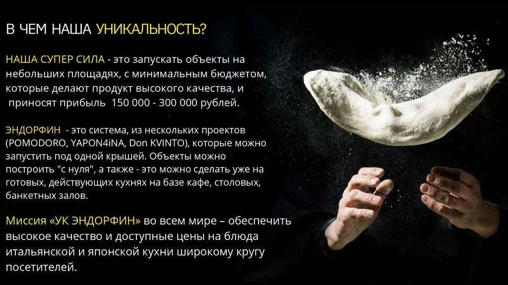 Пиццерия Pomodoro Royal – это прибыльный бизнес, так как пицца и суши одни из самых востребованных продуктов. При формате цеха количество заказов составляет 25-40 в будни и 45-70 в выходные.