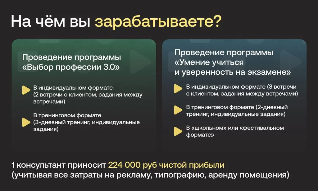 Наши партнёры получают полностью готовый, высокоприбыльный бизнес в перспективной сфере. 🎓 Профессиональная ориентация актуальна всегда, ведь грамотный выбор профессии — залог успешной карьеры.