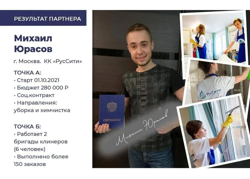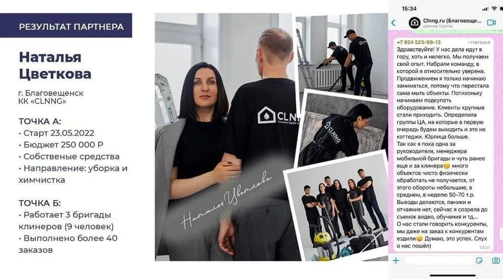 К 2023 году мы помогли открыть более 120 клининговых компаний и подготовили более 300 специалистов. Некоторые партнёры уже вышли на прибыль до 2,5 млн рублей в месяц 💰