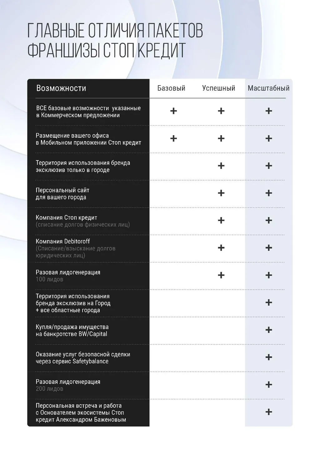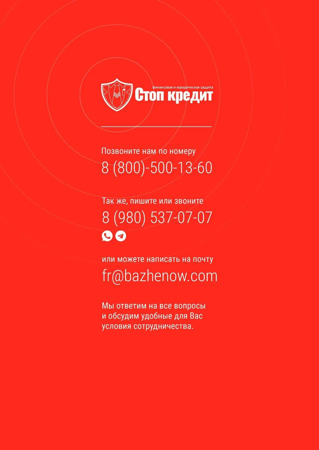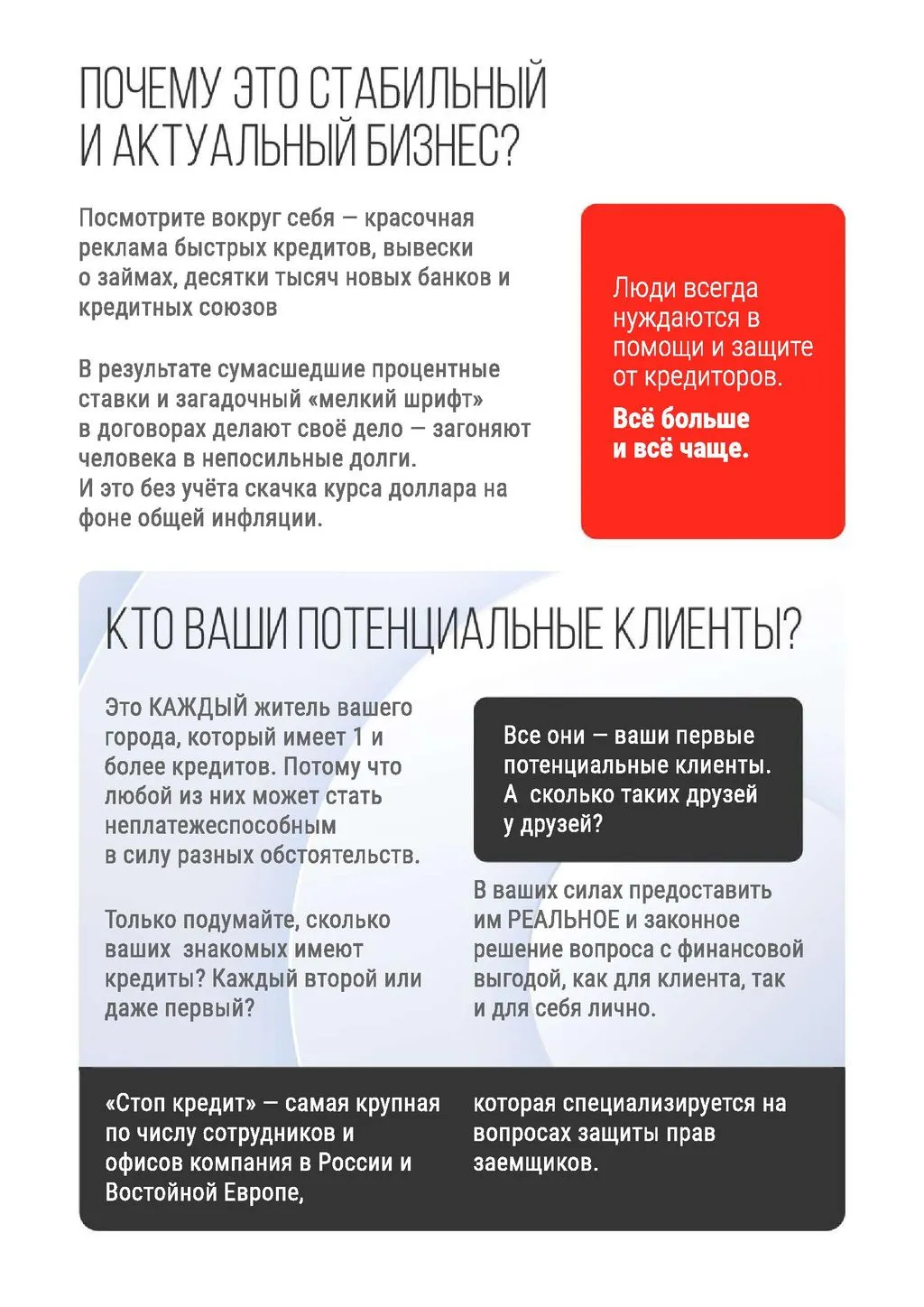 «Стоп кредит» — это бизнес с благородной миссией, направленный на списание долгов физических лиц, ИП и юридических лиц, а также ведение споров с банками и кредитными организациями. 🌟