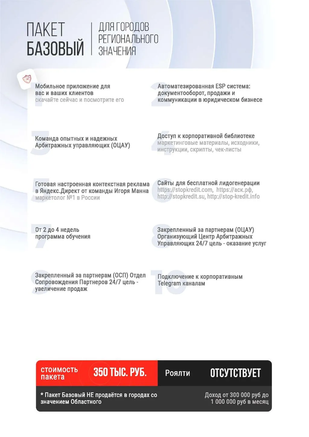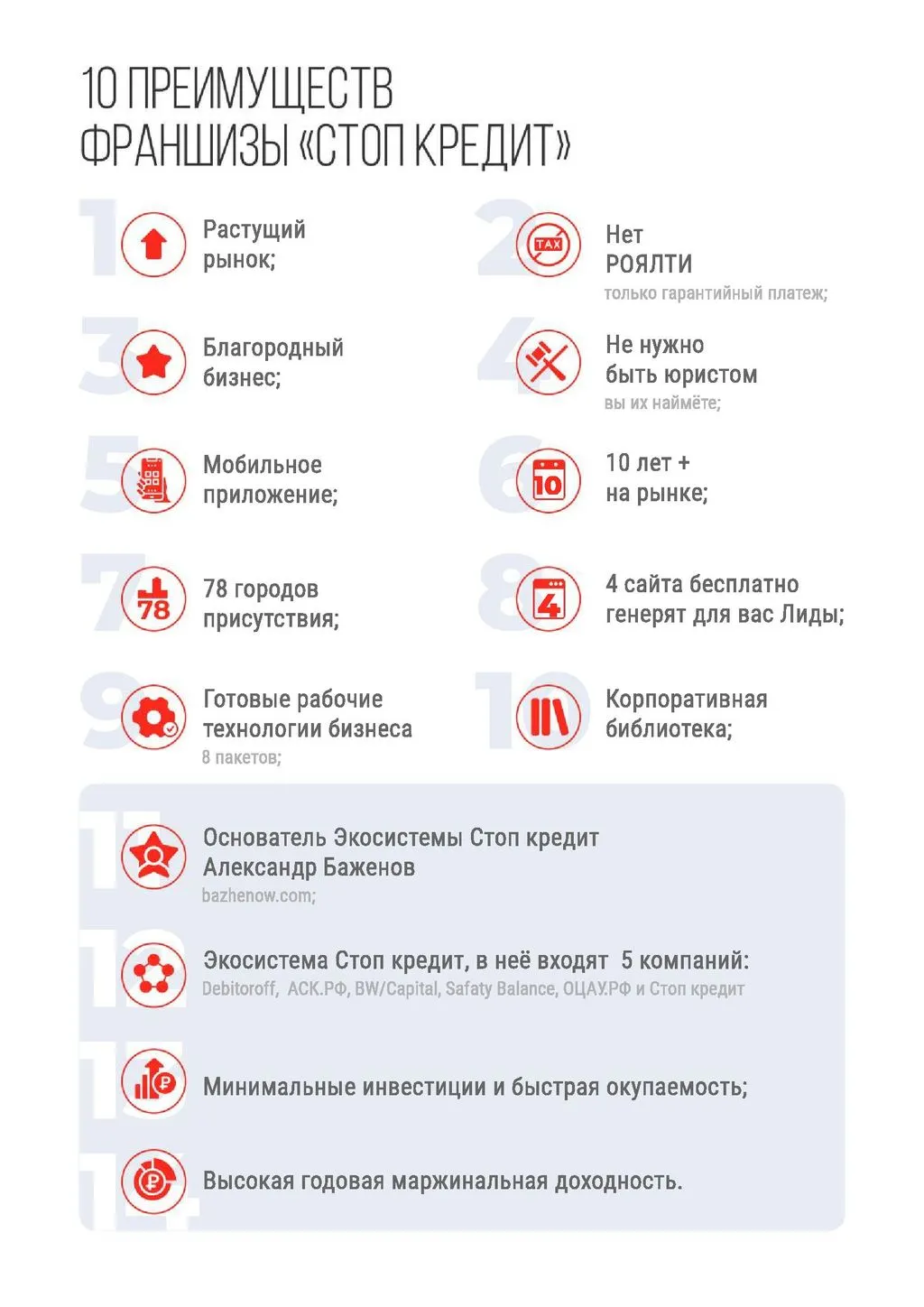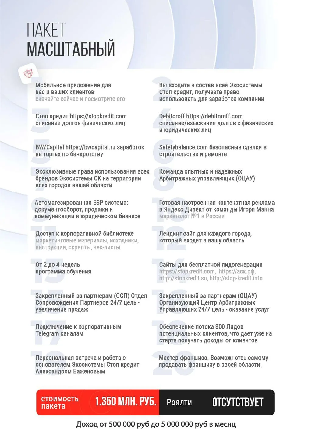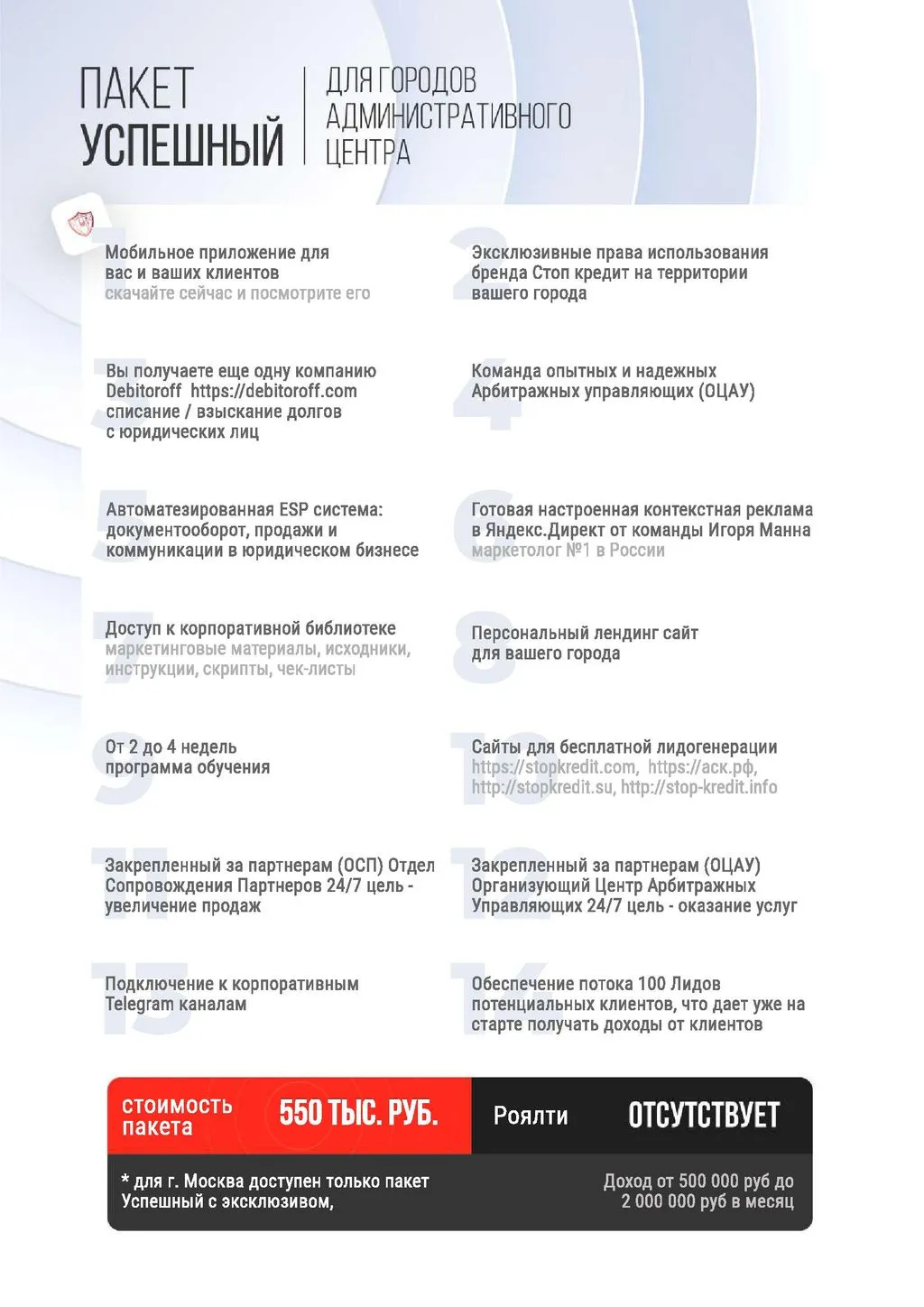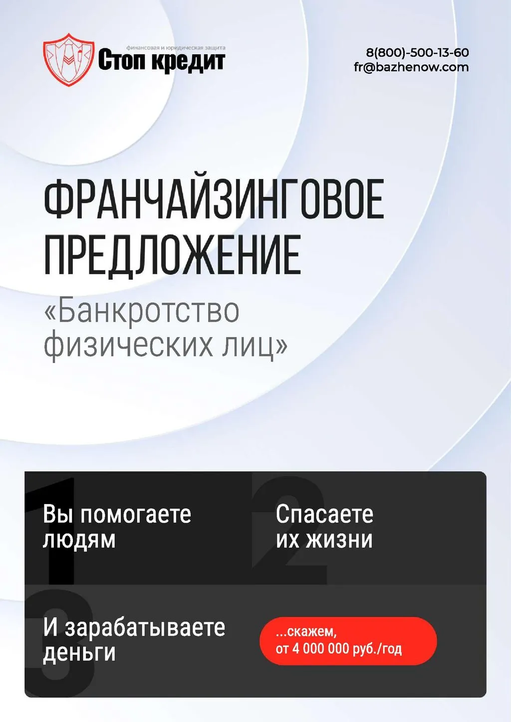 Франшиза «Стоп Кредит» — это готовая модель для открытия собственного агентства по банкротству физических и юридических лиц. Вместе с нашей опытной командой вы сможете предоставлять услуги по списанию долгов и зарабатывать от 300 000 до 5 000 000 рублей ежемесячно. 💰