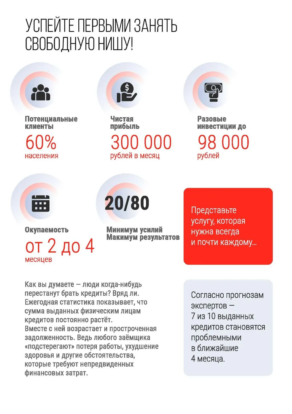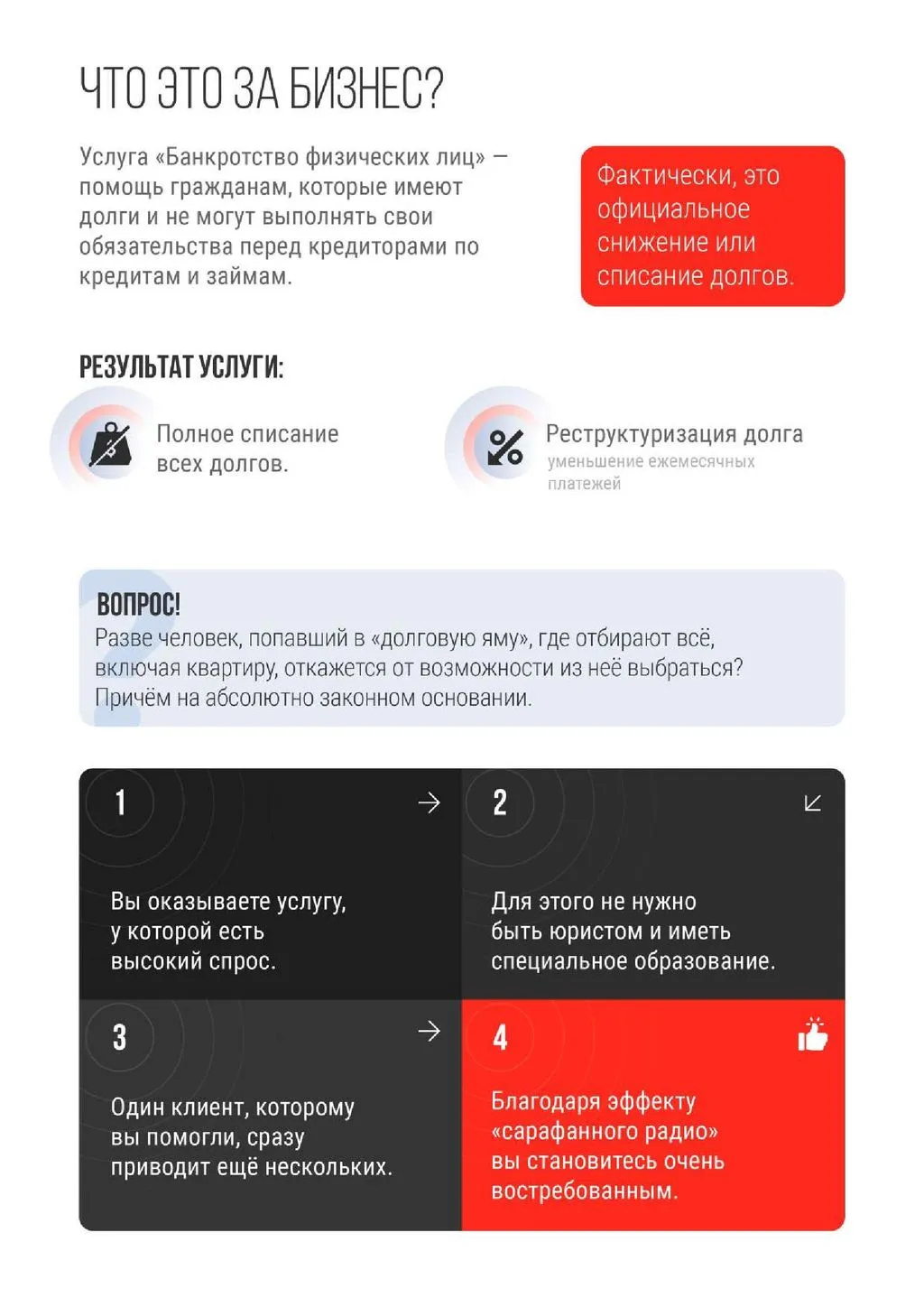 Спрос на списание долгов для физических лиц продолжает расти! 🚀 Потенциальная аудитория насчитывает более 70 млн человек. Мы предлагаем вам присоединиться к нашей сети и занять эту нишу в своём городе. 🌍