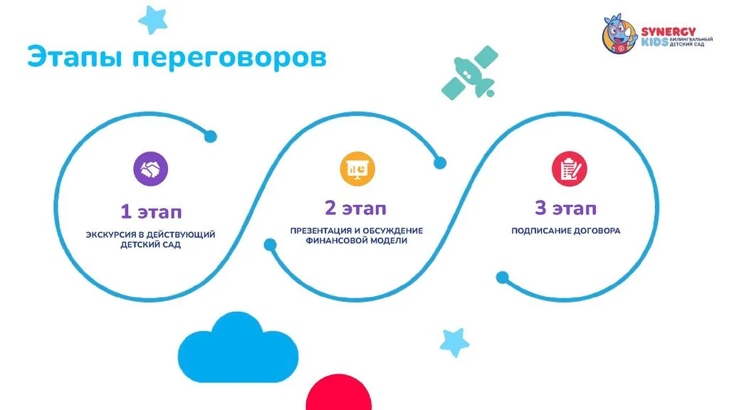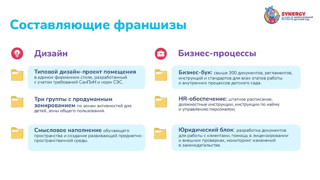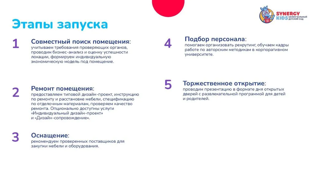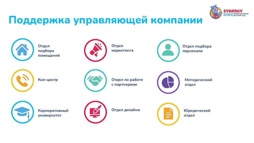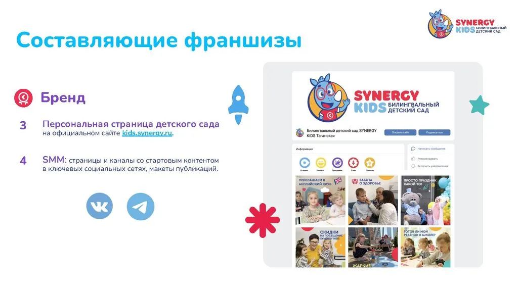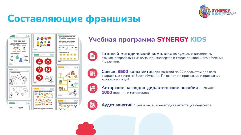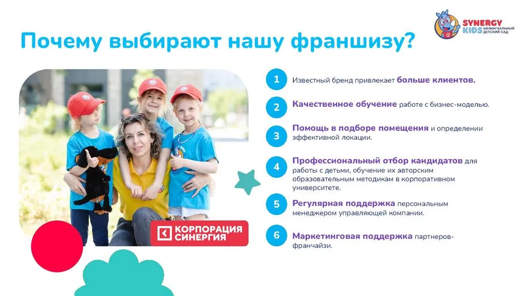 Мы разработали детальную модель, собрали команду, продумали каждый шаг для успешного открытия и развития. Присоединяйтесь к проекту Synergy Kids и запускайте свой бизнес. 🚀